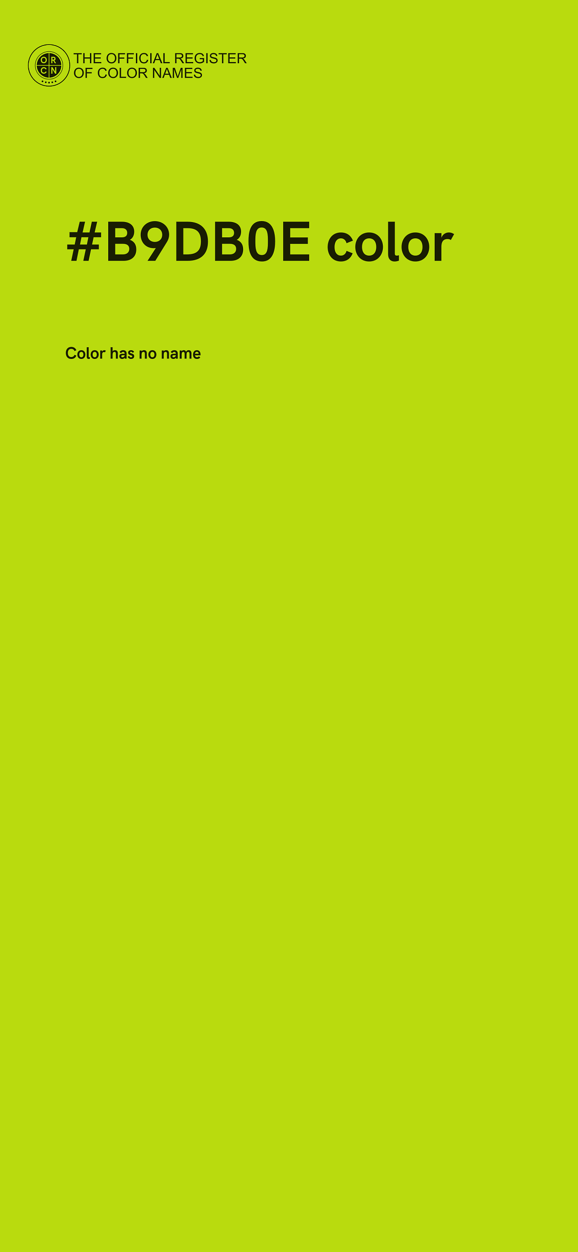 For printing in non digital world, #B9DB0E is represented in CMYK as 13 Cyan, 0 Magenta, 80 Yellow, and 14 Black (Key) (C:13 M:0 Y:80 K:14).