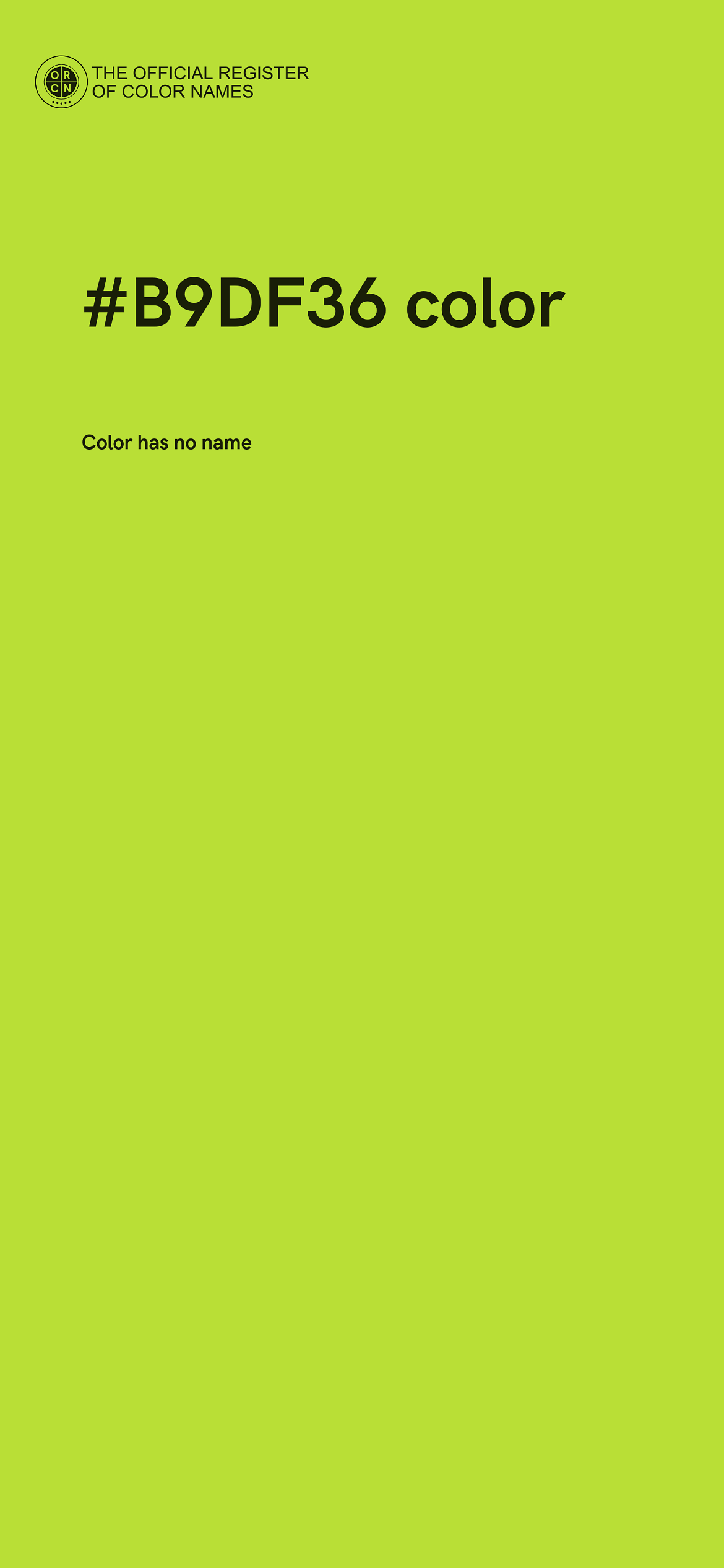 The digital color HEX #B9DF36 belongs to the Yellow Color Family featuring High Saturation (Saturation Family) and Light (Brightness Family).