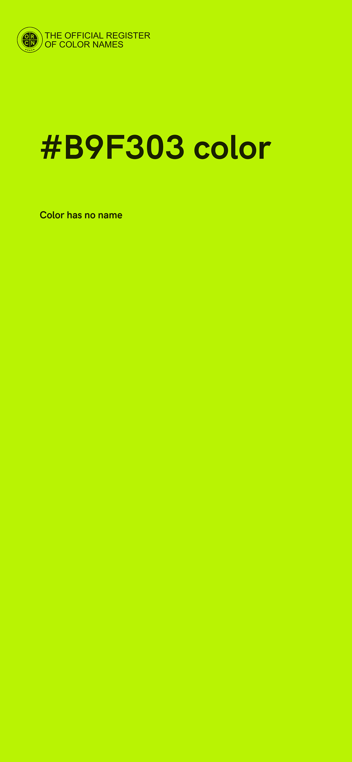 For printing in non digital world, #B9F303 is represented in CMYK as 23 Cyan, 0 Magenta, 94 Yellow, and 5 Black (Key) (C:23 M:0 Y:94 K:5).