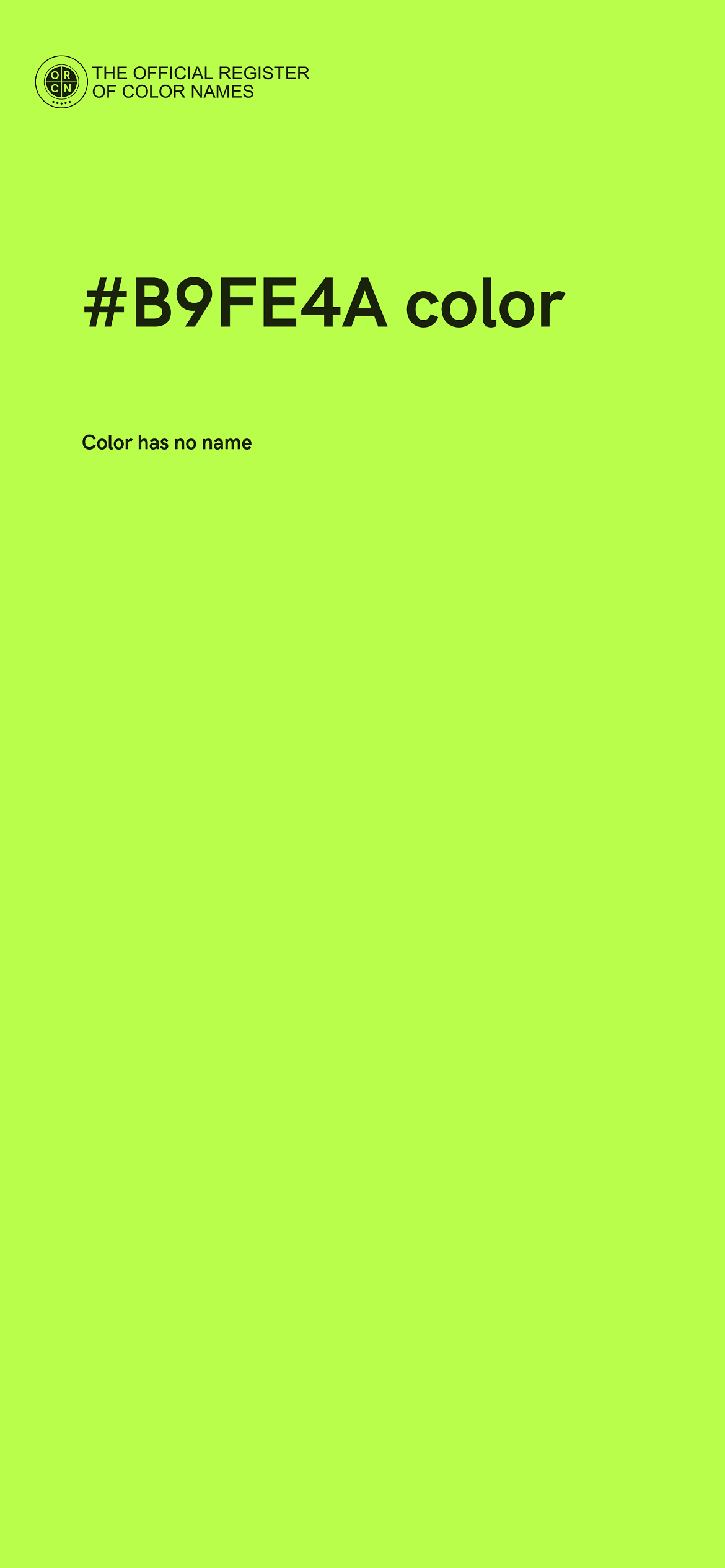 The digital color HEX #B9FE4A belongs to the Chartreuse Color Family featuring Full Saturation (Saturation Family) and Very Light (Brightness Family).