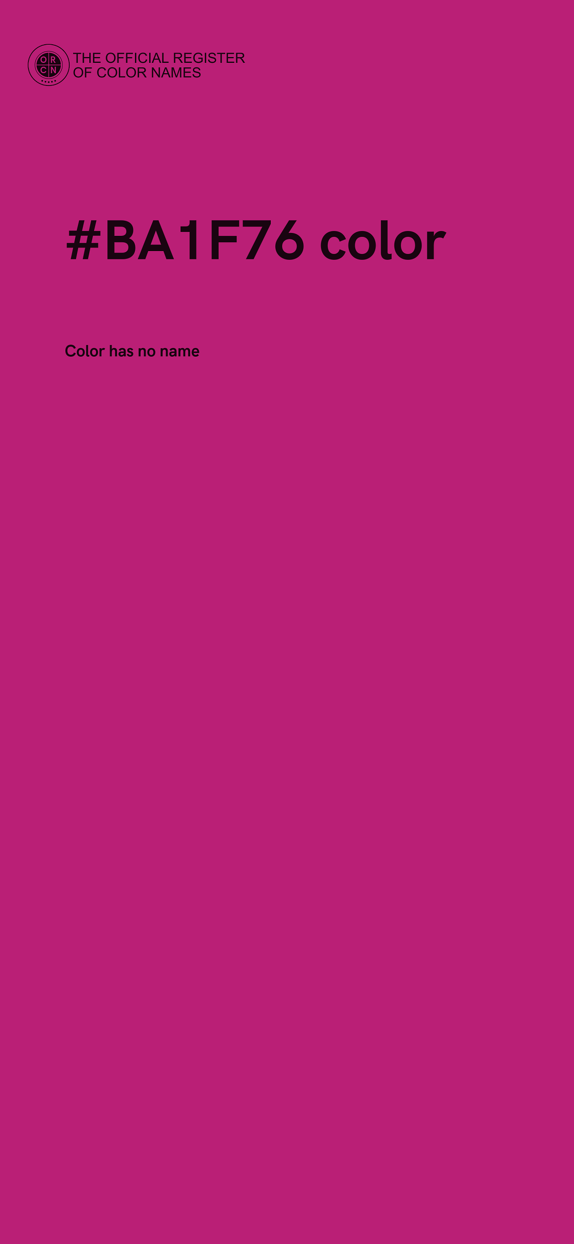 The digital color HEX #BA1F76 belongs to the Rose Color Family featuring High Saturation (Saturation Family) and Light (Brightness Family).