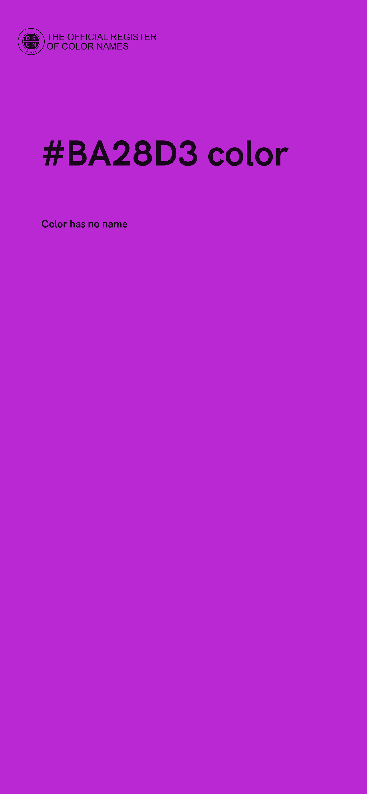 The digital color HEX #BA28D3 belongs to the Magenta Color Family featuring High Saturation (Saturation Family) and Light (Brightness Family).