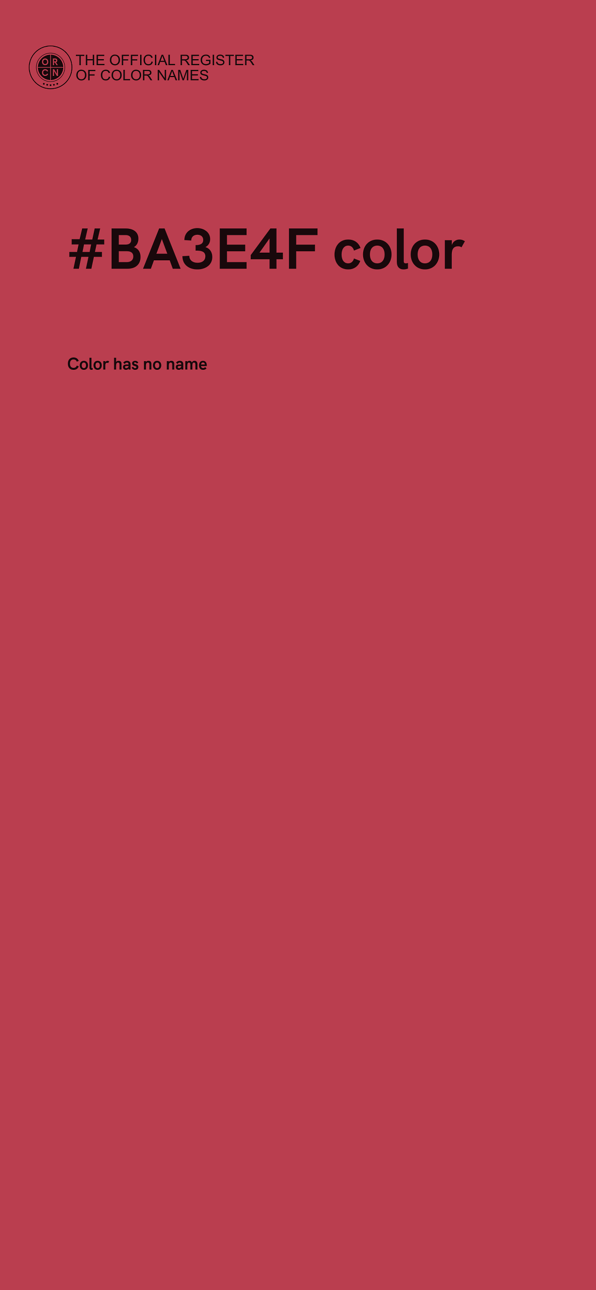 The digital color HEX #BA3E4F belongs to the Red Color Family featuring Moderate Saturation (Saturation Family) and Light (Brightness Family).