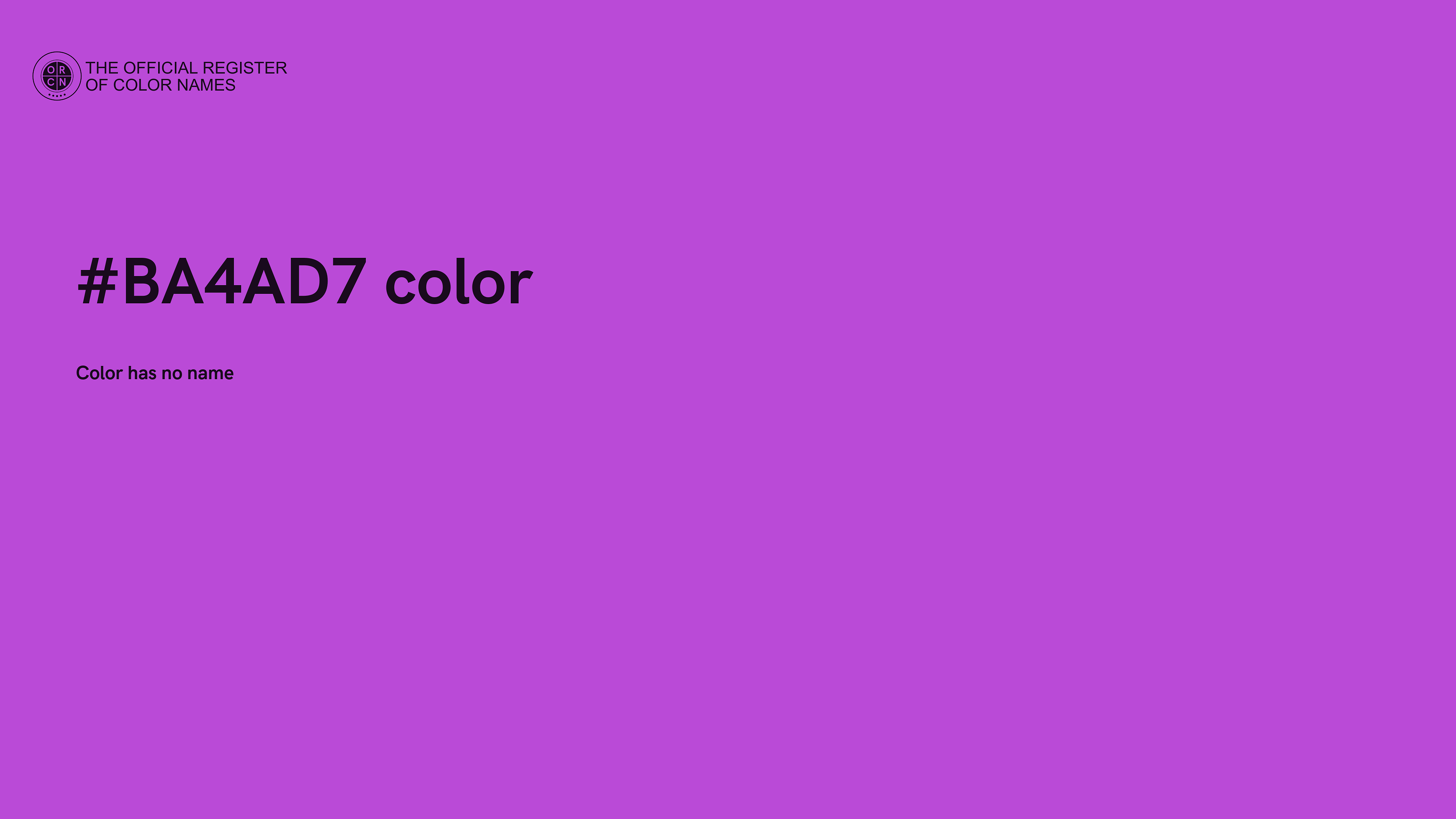 For printing in non digital world, #BA4AD7 is represented in CMYK as 11 Cyan, 55 Magenta, 0 Yellow, and 16 Black (Key) (C:11 M:55 Y:0 K:16).