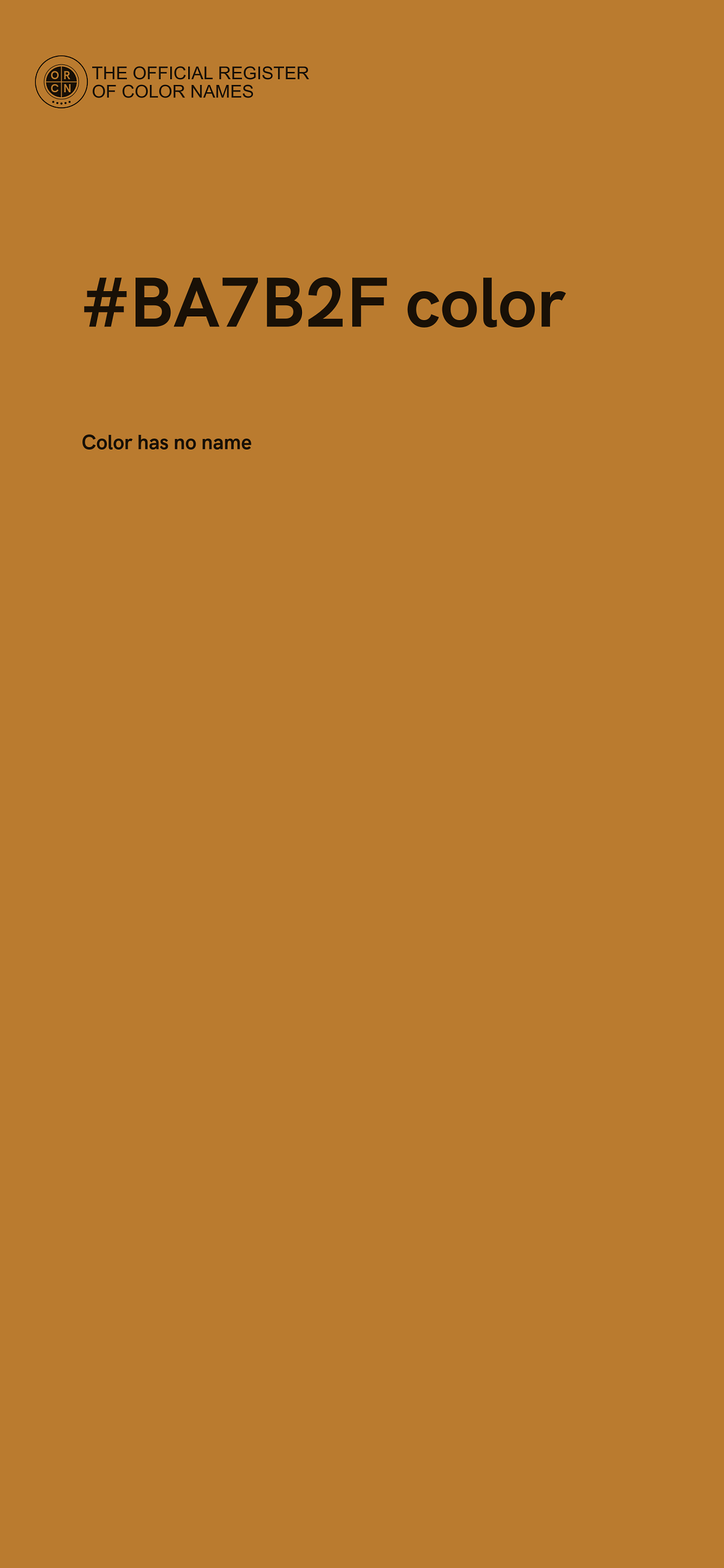 The digital color HEX #BA7B2F belongs to the Orange Color Family featuring High Saturation (Saturation Family) and Light (Brightness Family).