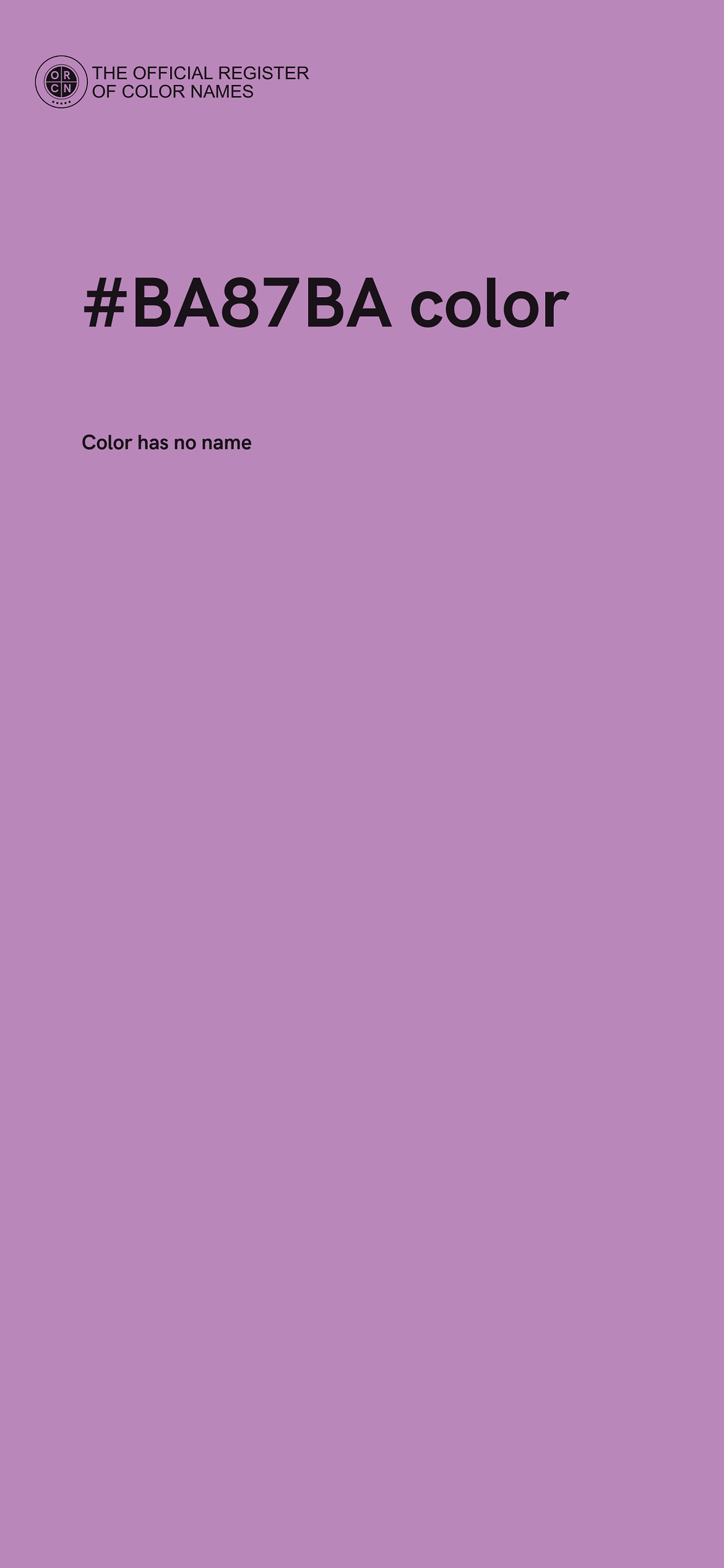 The digital color HEX #BA87BA belongs to the Magenta Color Family featuring Mild Saturation (Saturation Family) and Very Light (Brightness Family).