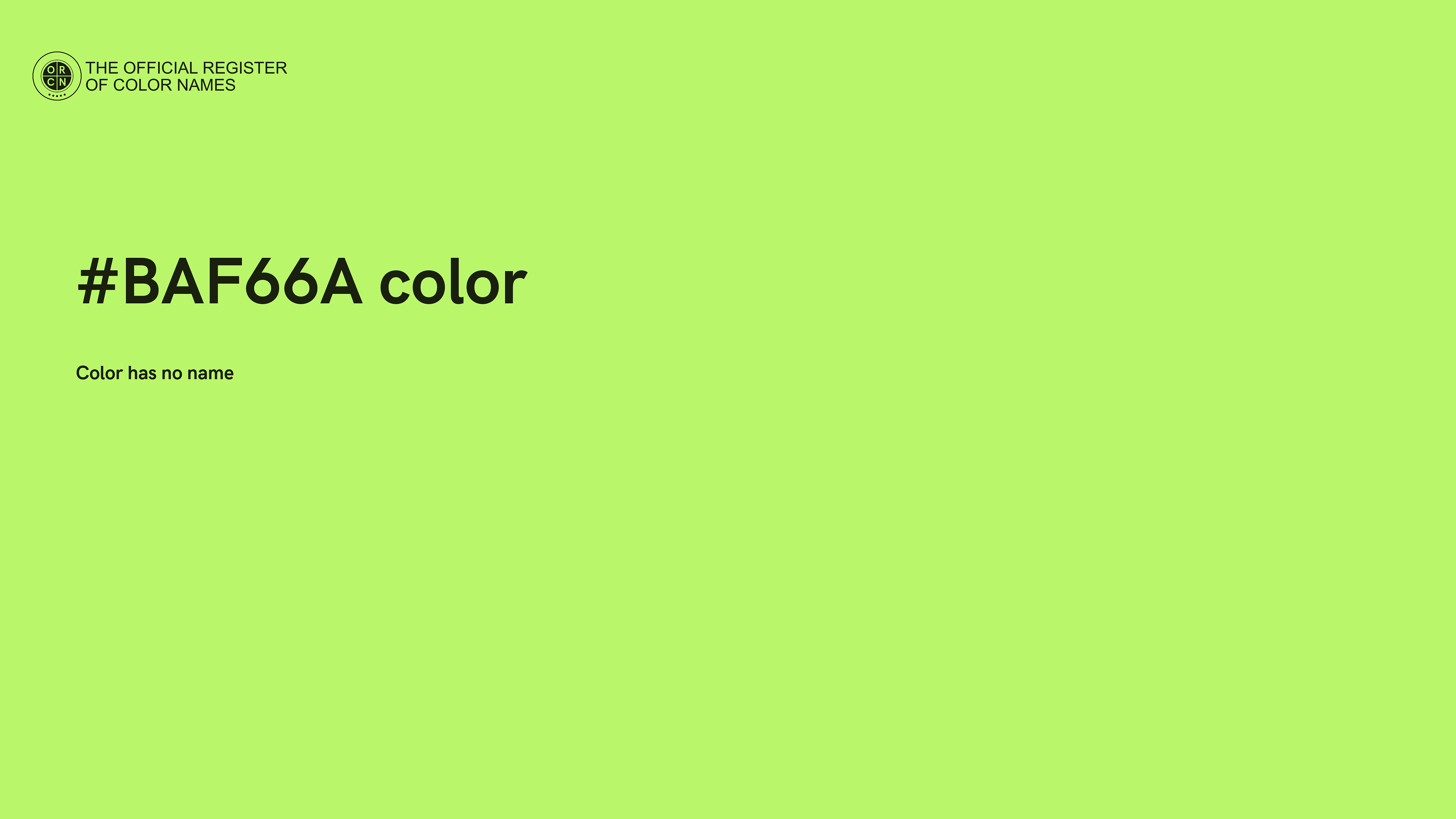 The digital color HEX #BAF66A belongs to the Chartreuse Color Family featuring Full Saturation (Saturation Family) and Very Light (Brightness Family).