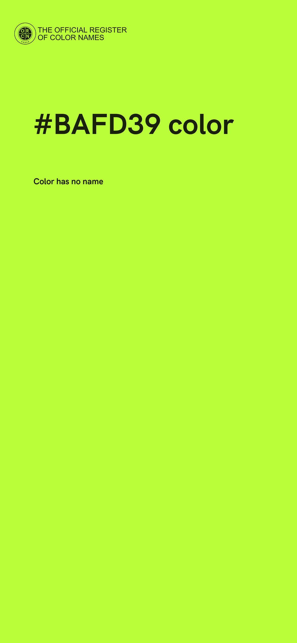 For printing in non digital world, #BAFD39 is represented in CMYK as 26 Cyan, 0 Magenta, 77 Yellow, and 1 Black (Key) (C:26 M:0 Y:77 K:1).