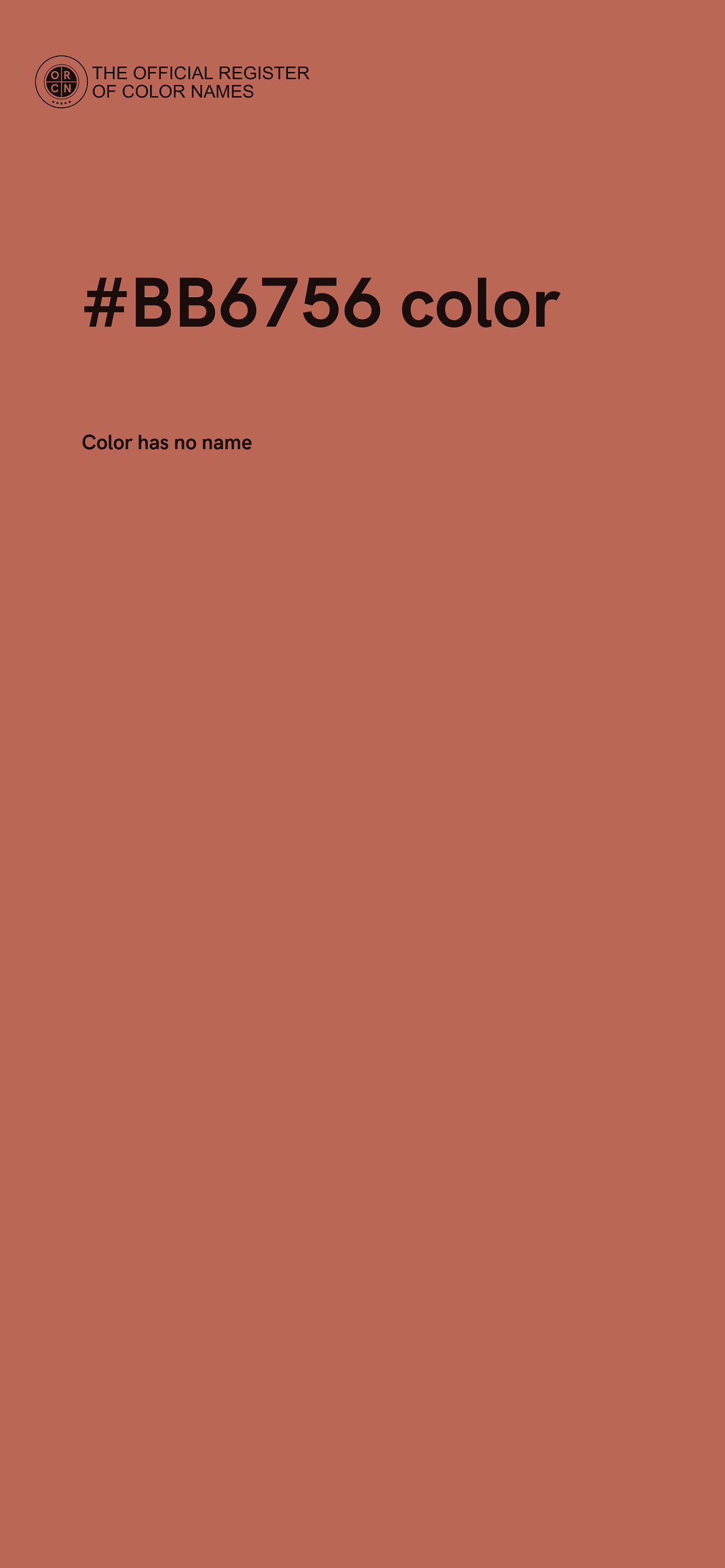 For printing in non digital world, #BB6756 is represented in CMYK as 0 Cyan, 33 Magenta, 40 Yellow, and 27 Black (Key) (C:0 M:33 Y:40 K:27).