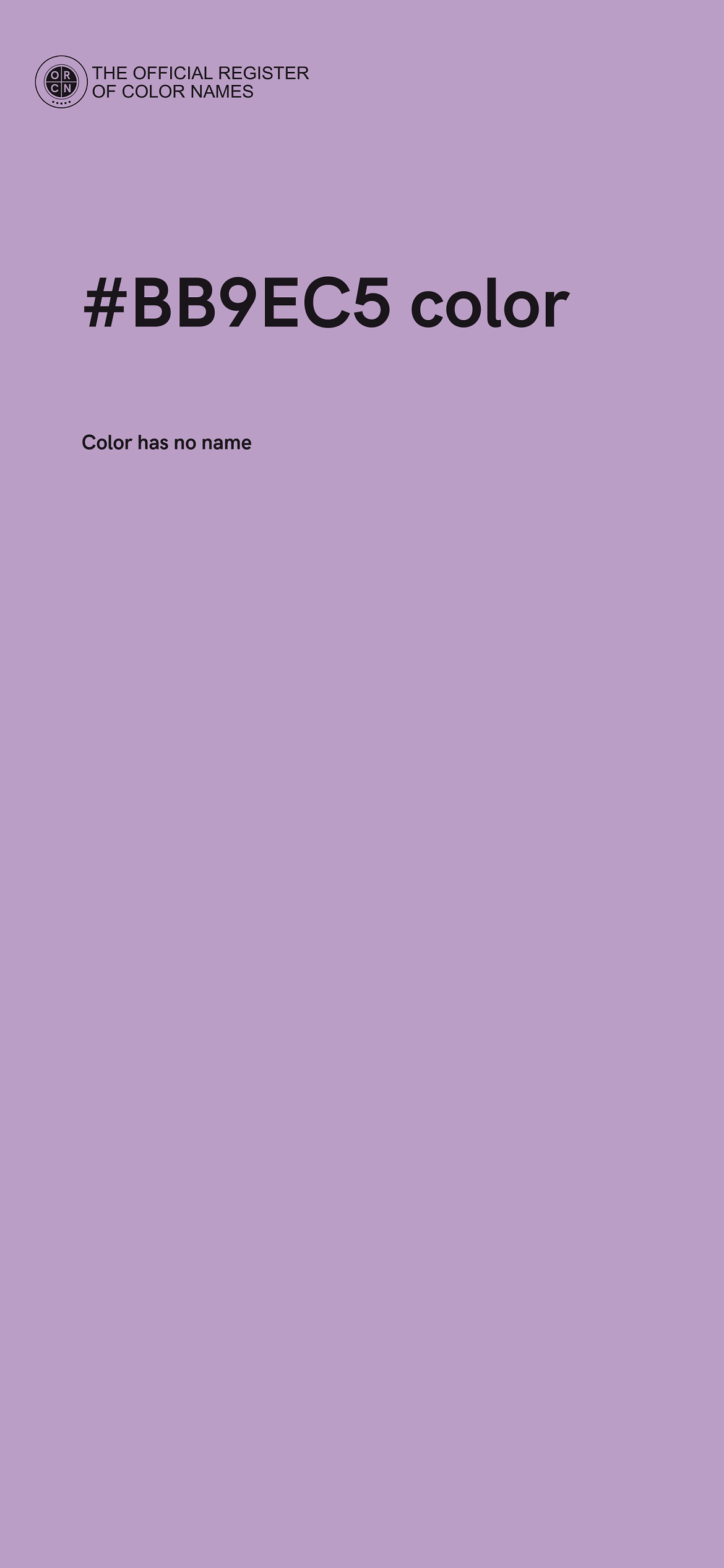 For printing in non digital world, #BB9EC5 is represented in CMYK as 4 Cyan, 15 Magenta, 0 Yellow, and 23 Black (Key) (C:4 M:15 Y:0 K:23).