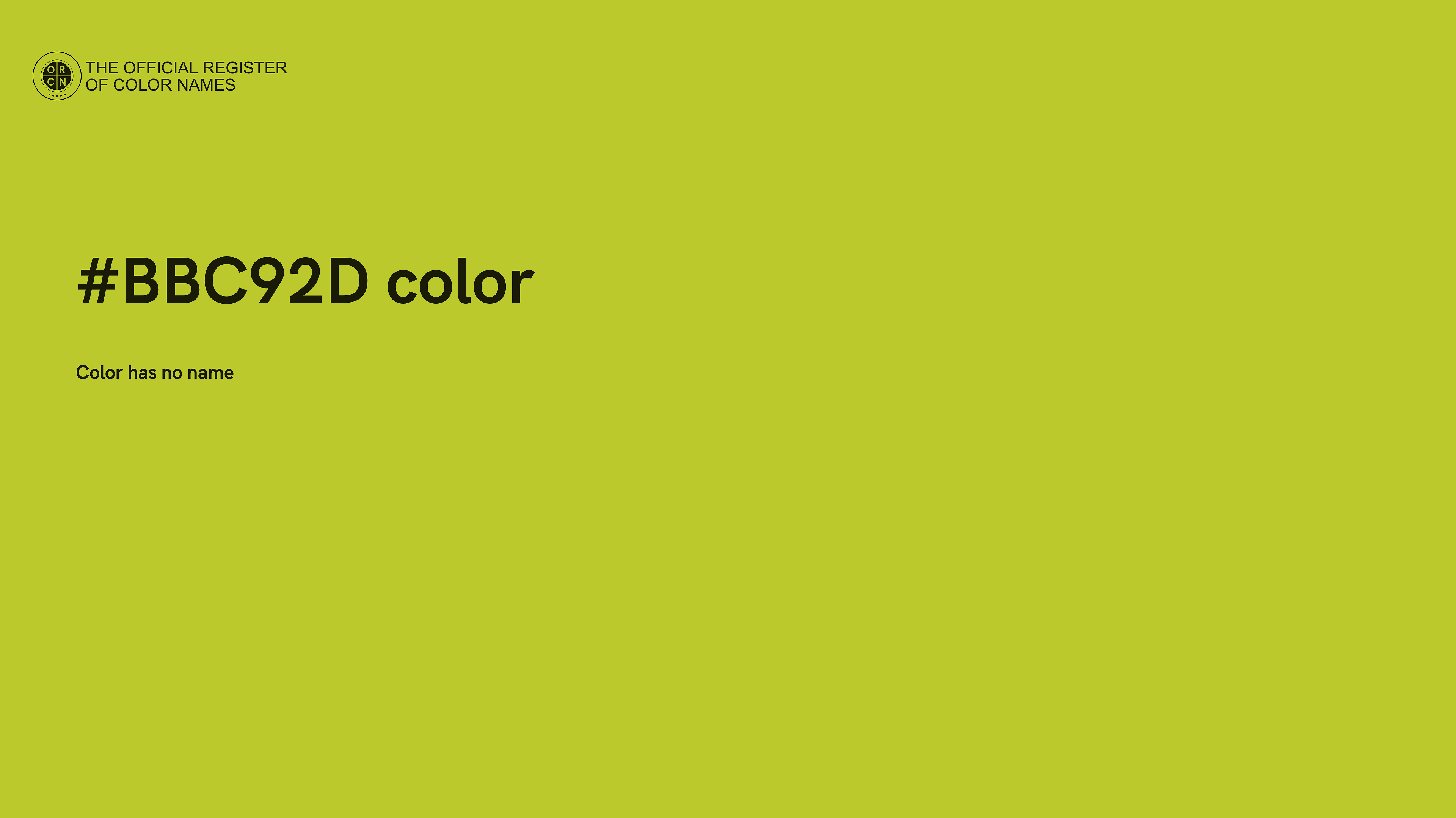 The digital color HEX #BBC92D belongs to the Yellow Color Family featuring High Saturation (Saturation Family) and Light (Brightness Family).