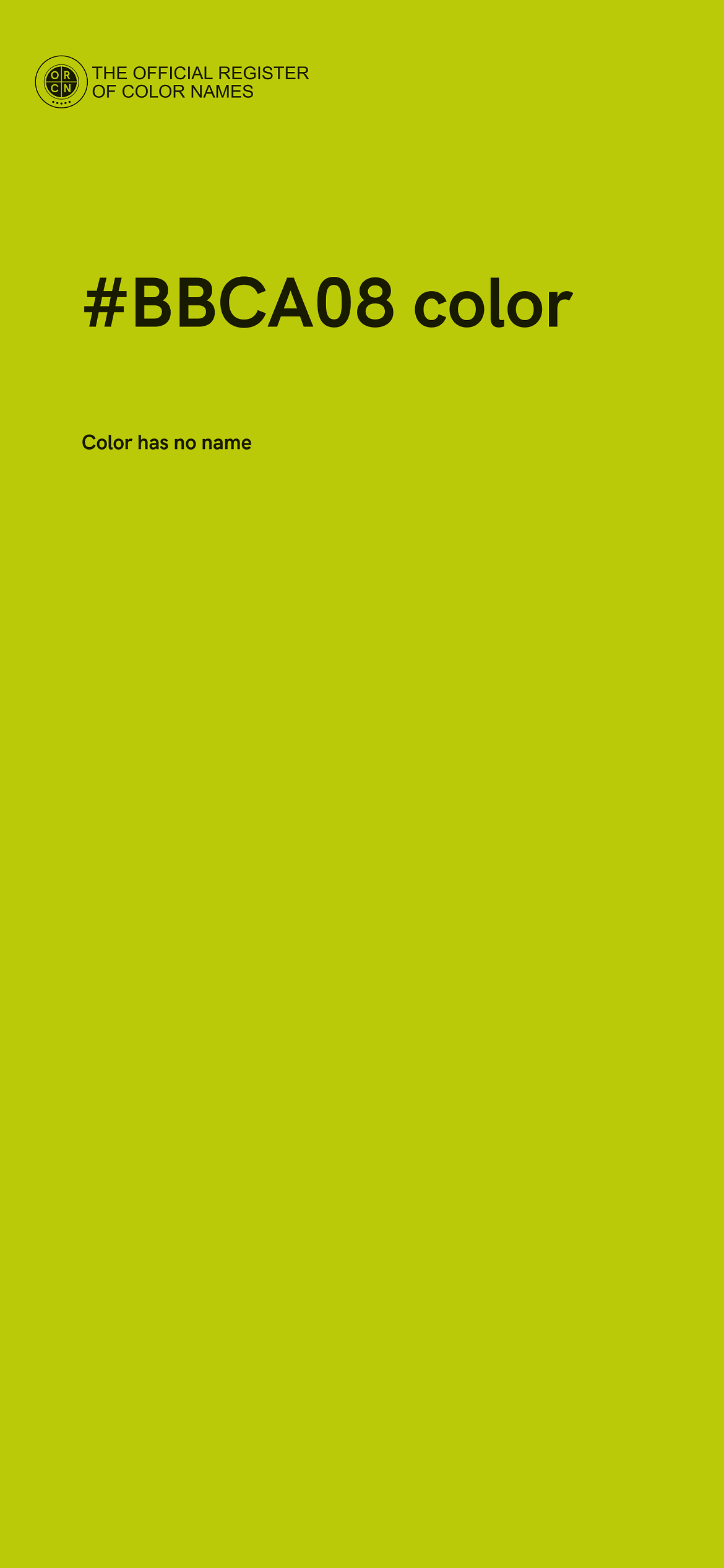 For printing in non digital world, #BBCA08 is represented in CMYK as 6 Cyan, 0 Magenta, 76 Yellow, and 21 Black (Key) (C:6 M:0 Y:76 K:21).