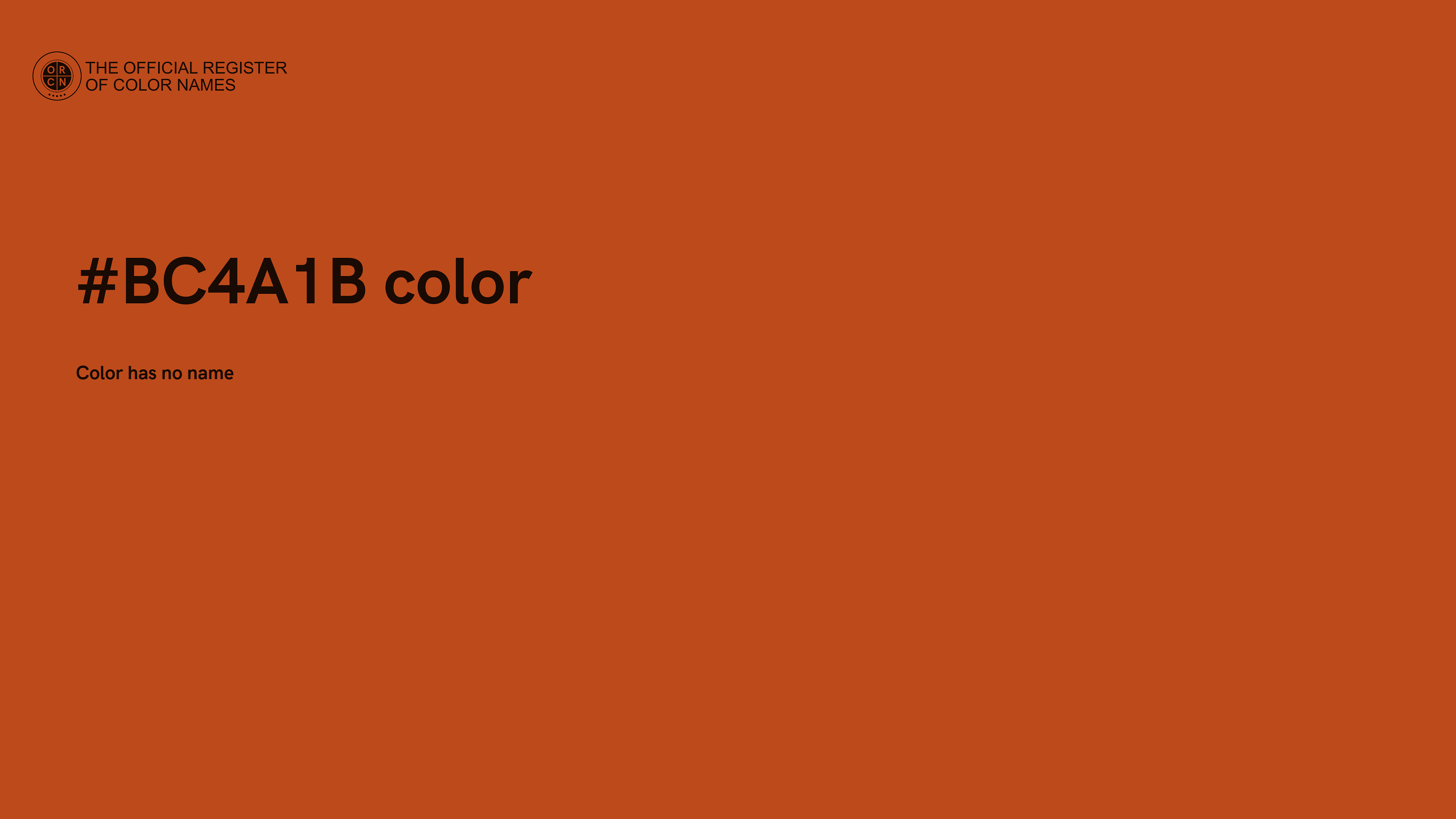 The digital color HEX #BC4A1B belongs to the Orange Color Family featuring High Saturation (Saturation Family) and Light (Brightness Family).