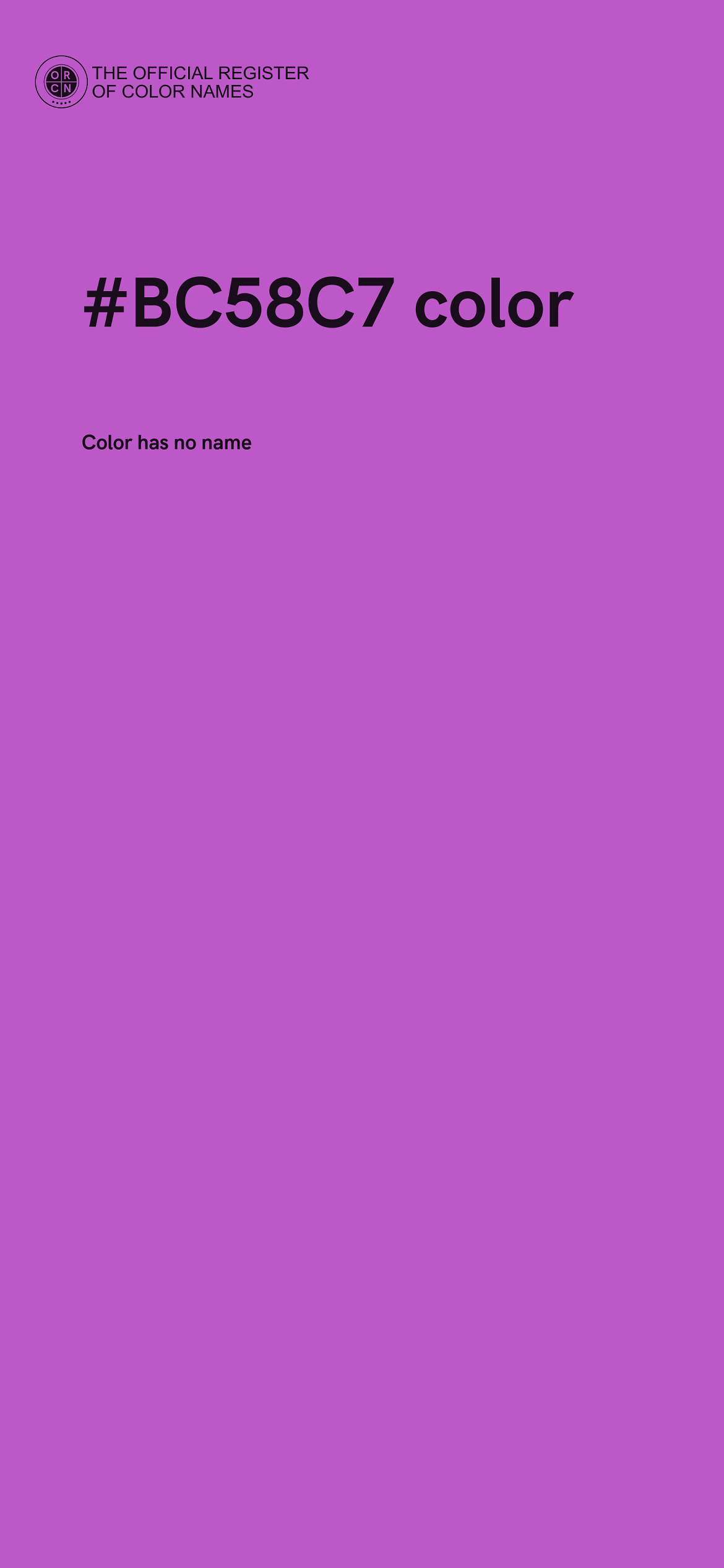 The digital color HEX #BC58C7 belongs to the Magenta Color Family featuring Moderate Saturation (Saturation Family) and Light (Brightness Family).