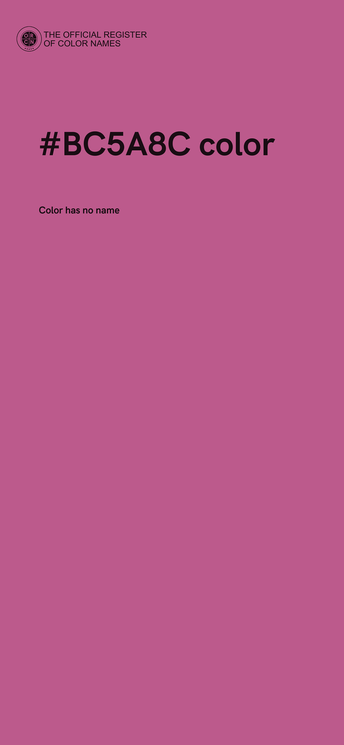 For printing in non digital world, #BC5A8C is represented in CMYK as 0 Cyan, 38 Magenta, 19 Yellow, and 26 Black (Key) (C:0 M:38 Y:19 K:26).