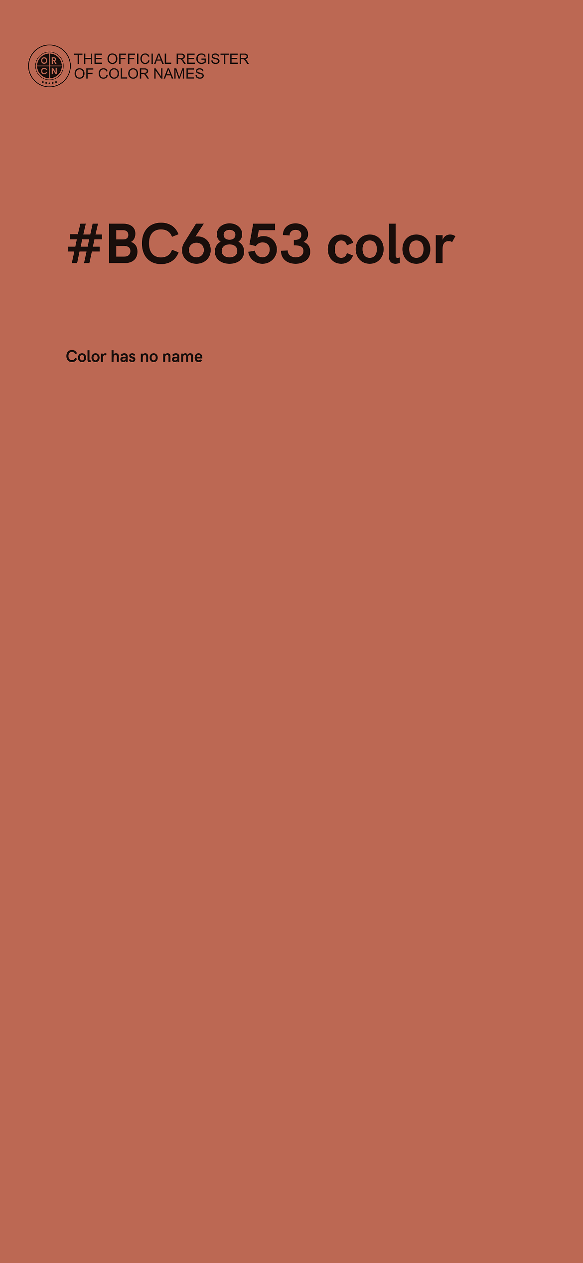 For printing in non digital world, #BC6853 is represented in CMYK as 0 Cyan, 33 Magenta, 41 Yellow, and 26 Black (Key) (C:0 M:33 Y:41 K:26).