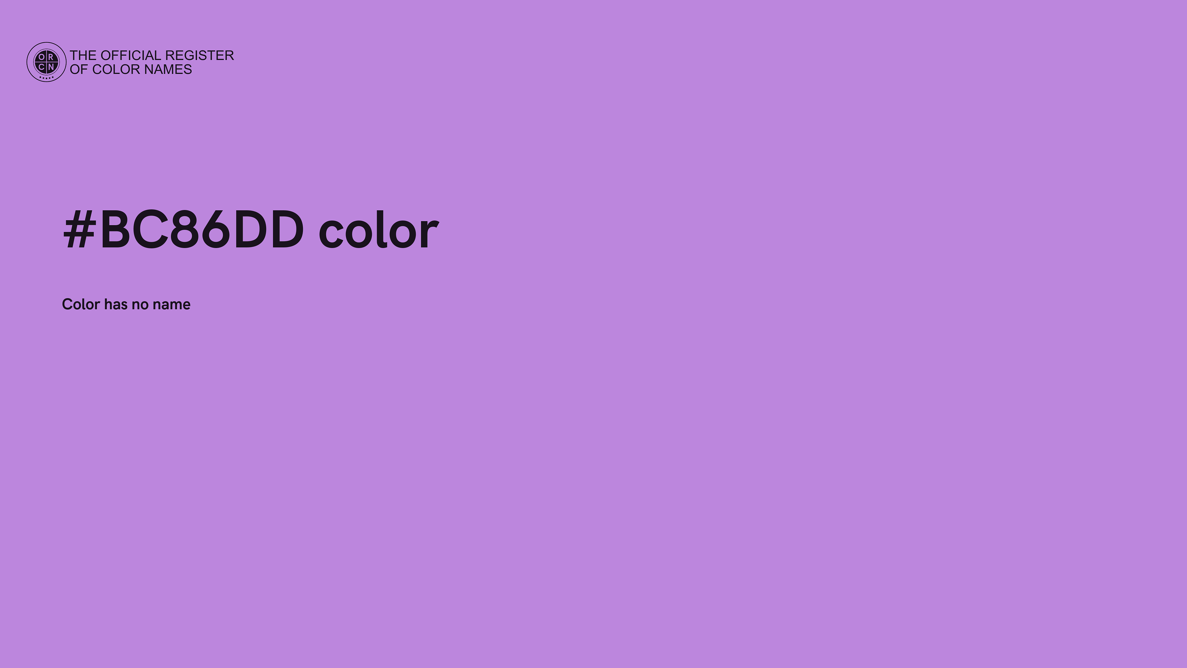 The digital color HEX #BC86DD belongs to the Violet Color Family featuring Moderate Saturation (Saturation Family) and Very Light (Brightness Family).