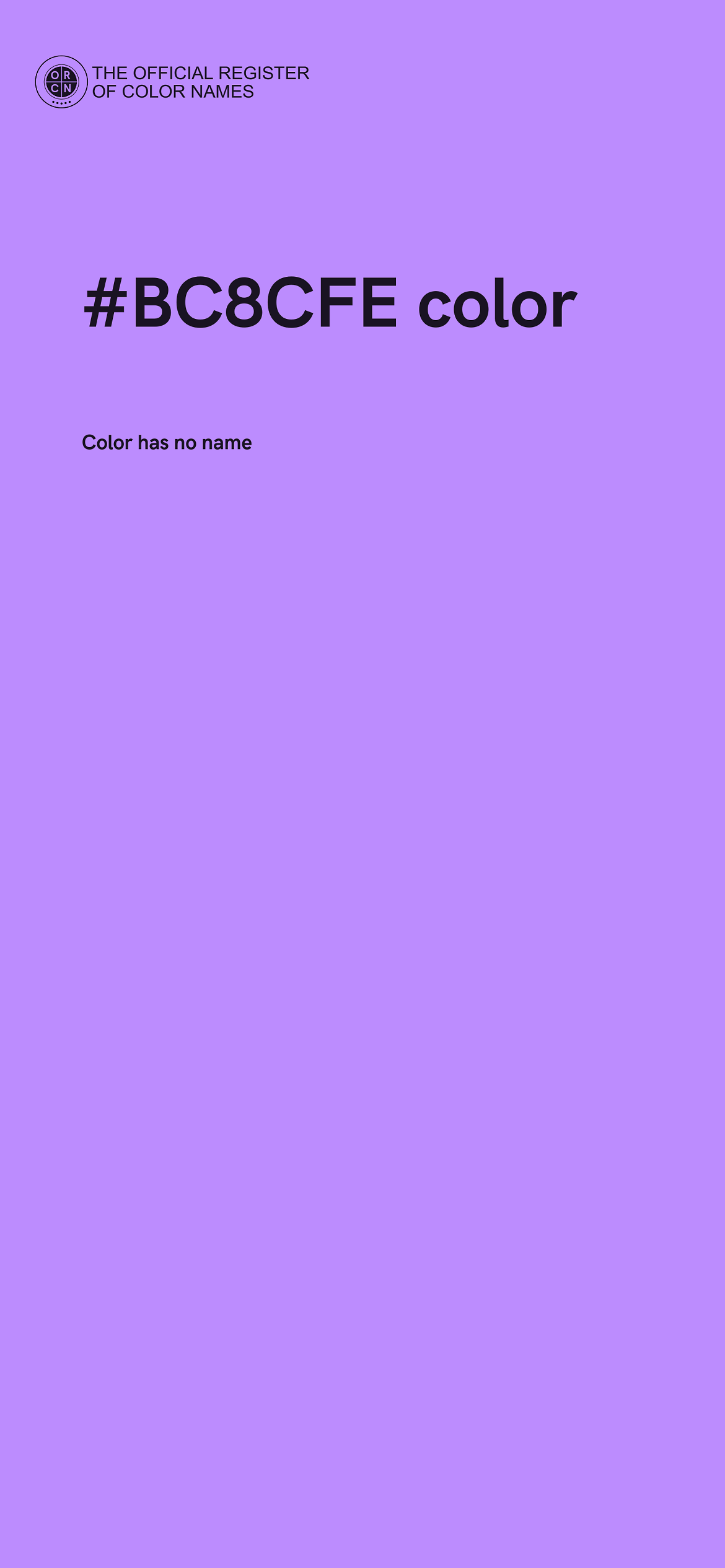 The digital color HEX #BC8CFE belongs to the Violet Color Family featuring Full Saturation (Saturation Family) and Very Light (Brightness Family).