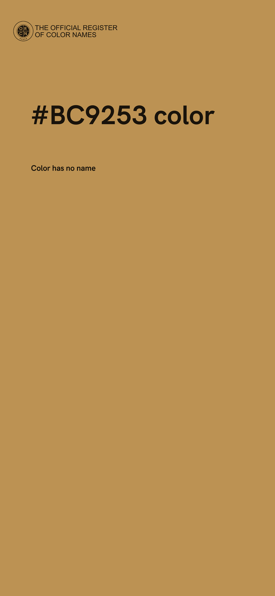 The digital color HEX #BC9253 belongs to the Orange Color Family featuring Moderate Saturation (Saturation Family) and Light (Brightness Family).