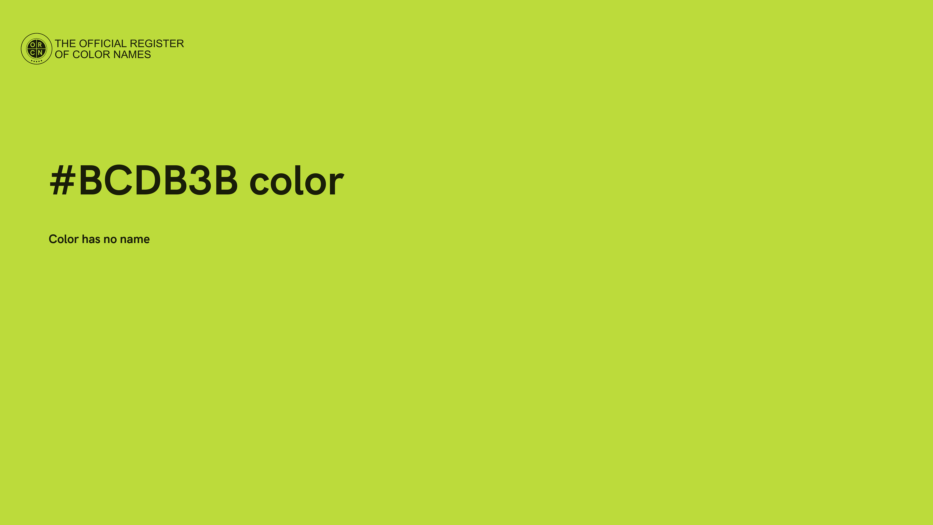 For printing in non digital world, #BCDB3B is represented in CMYK as 12 Cyan, 0 Magenta, 63 Yellow, and 14 Black (Key) (C:12 M:0 Y:63 K:14).