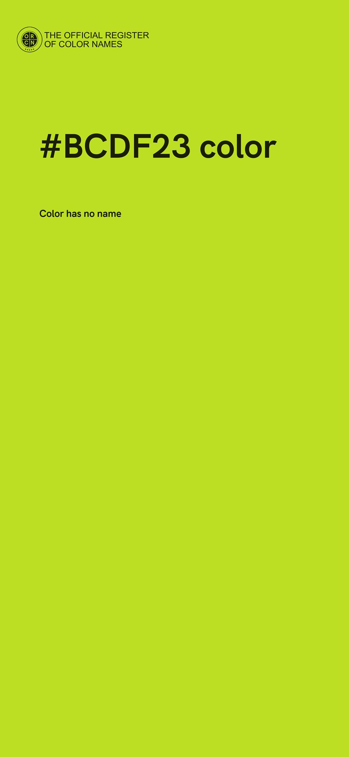 For printing in non digital world, #BCDF23 is represented in CMYK as 14 Cyan, 0 Magenta, 74 Yellow, and 13 Black (Key) (C:14 M:0 Y:74 K:13).