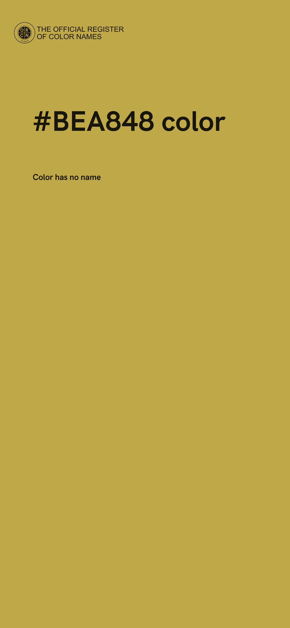 For printing in non digital world, #BEA848 is represented in CMYK as 0 Cyan, 9 Magenta, 46 Yellow, and 25 Black (Key) (C:0 M:9 Y:46 K:25).