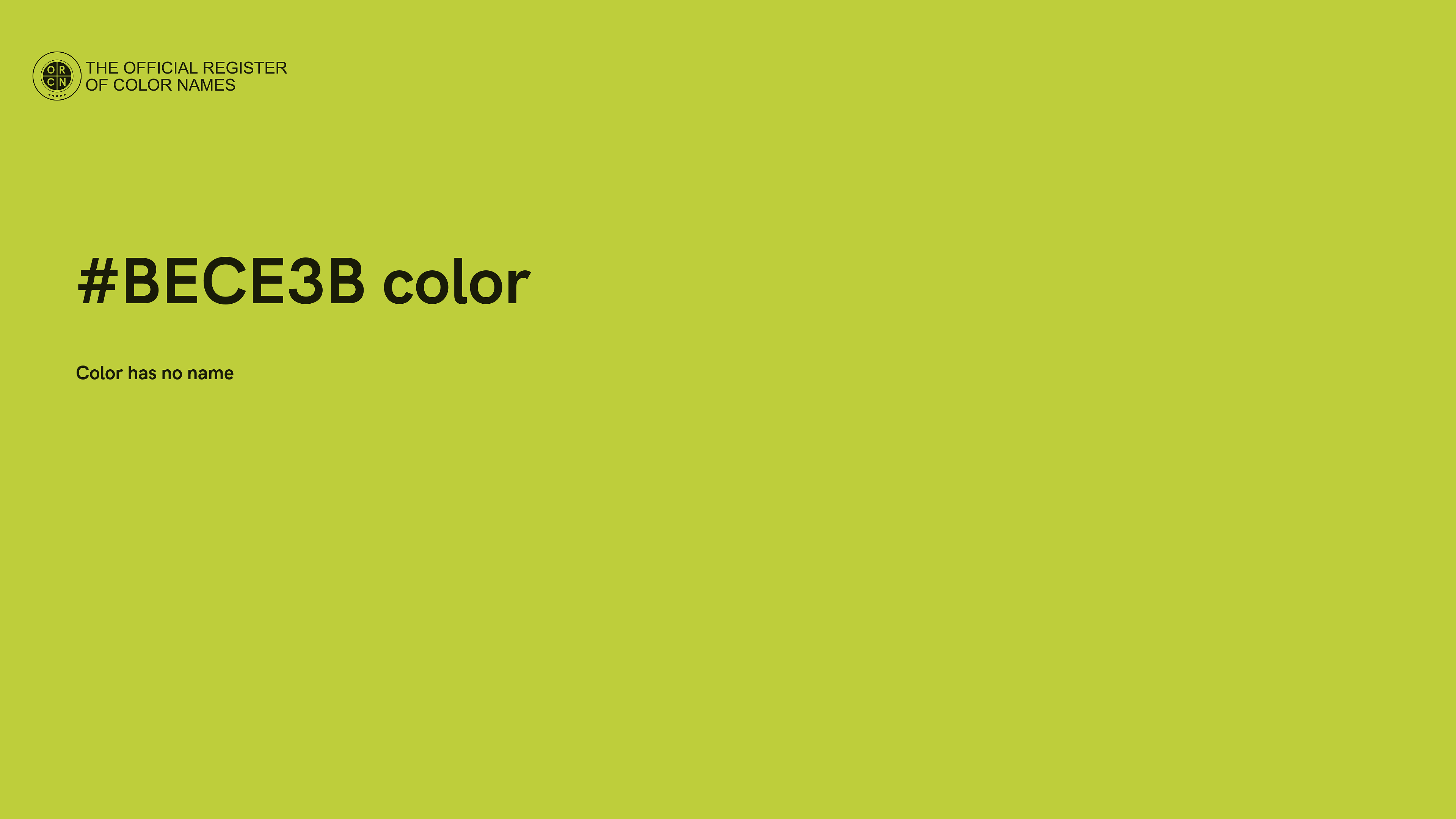 The digital color HEX #BECE3B belongs to the Yellow Color Family featuring High Saturation (Saturation Family) and Light (Brightness Family).