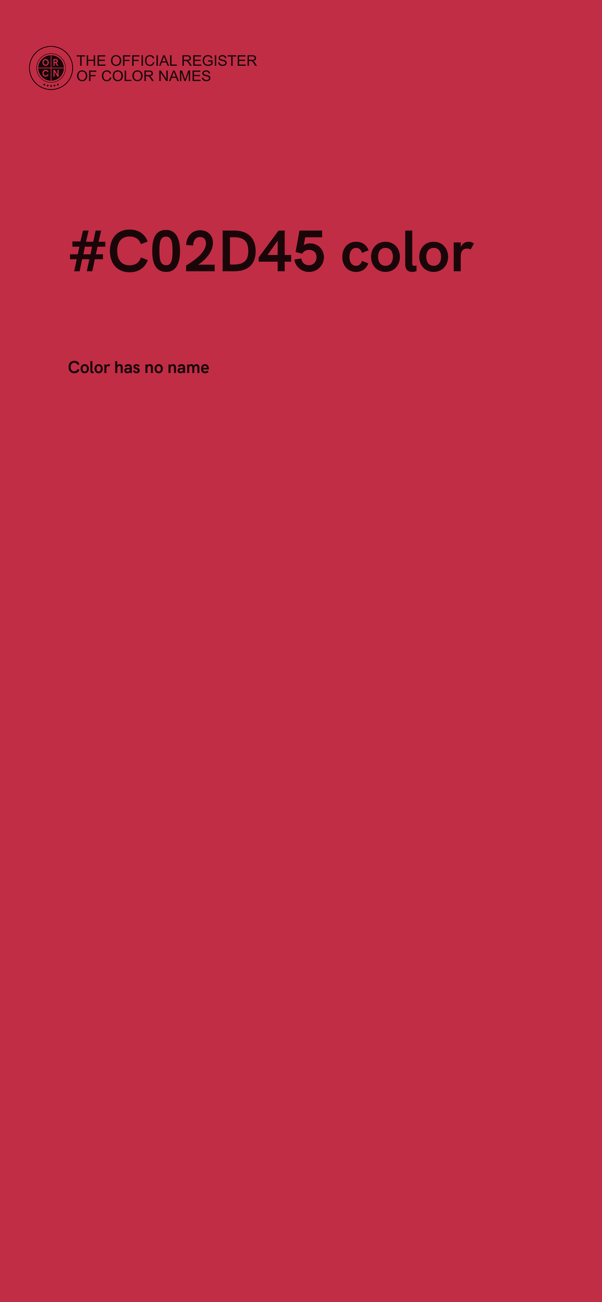 HEX code #C02D45 represent the color in hexadecimal format by combining three values – the amounts of Red, Green and Blue (RGB). Its RGB composition is 192, 45, 69 ( rgb(192, 45, 69) ), which breaks down into 75.3% of Red, 17.6% Green and 27.1% Blue.