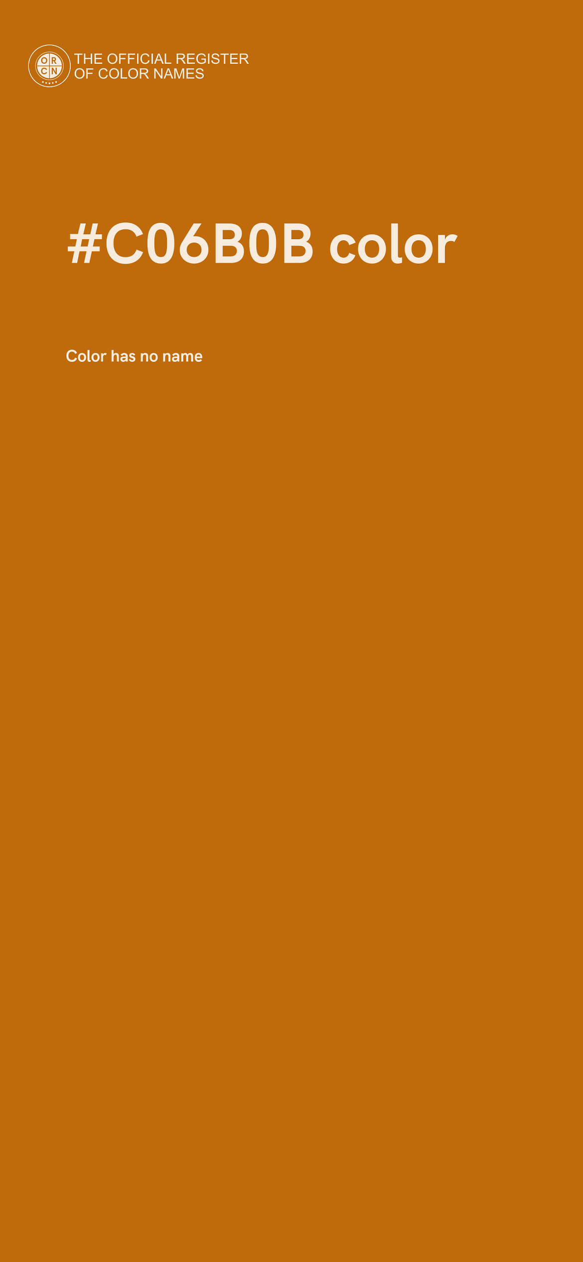 The digital color HEX #C06B0B belongs to the Orange Color Family featuring Full Saturation (Saturation Family) and Light (Brightness Family).