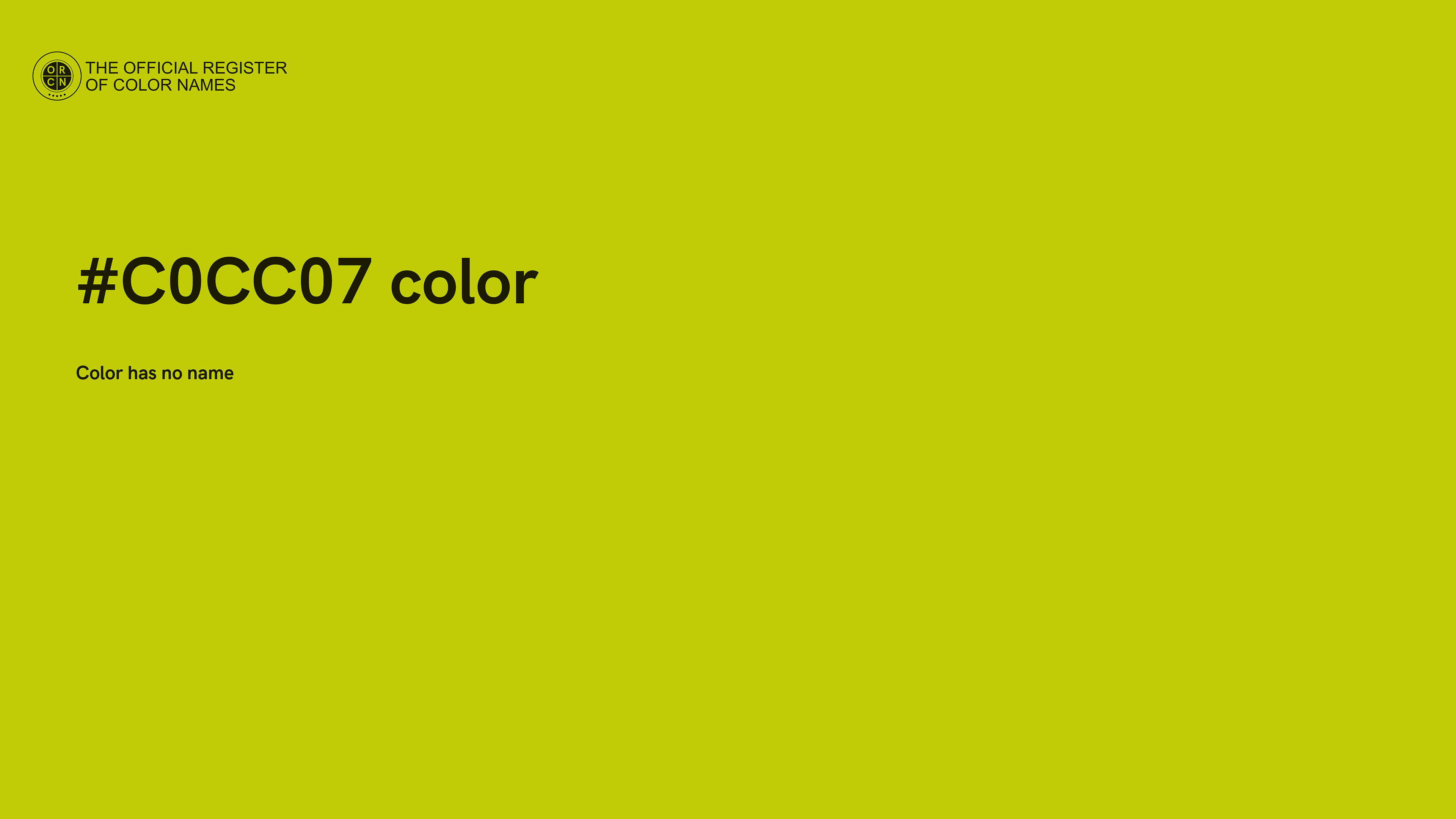 The digital color HEX #C0CC07 belongs to the Yellow Color Family featuring Full Saturation (Saturation Family) and Light (Brightness Family).