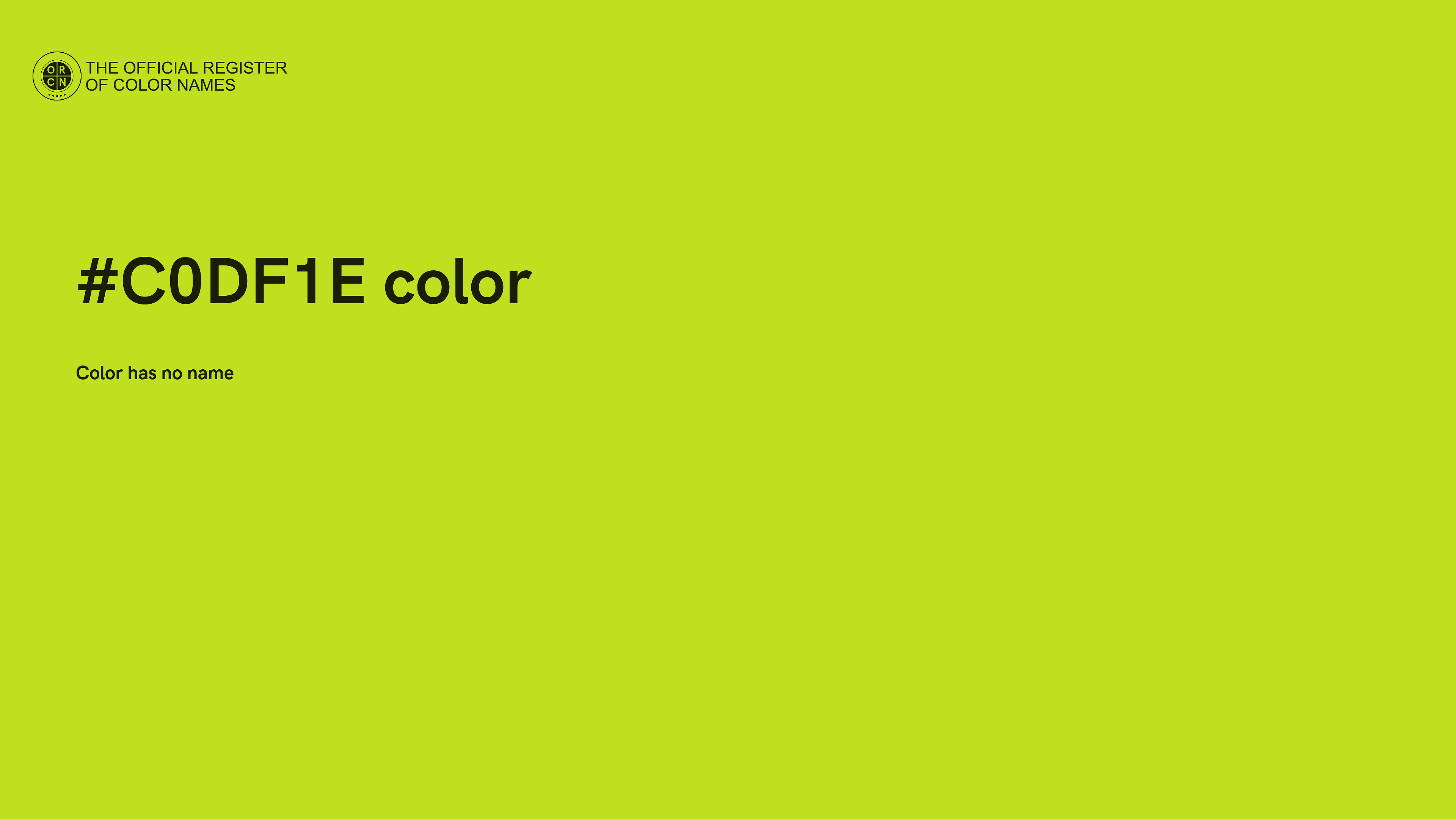 The digital color HEX #C0DF1E belongs to the Yellow Color Family featuring High Saturation (Saturation Family) and Light (Brightness Family).
