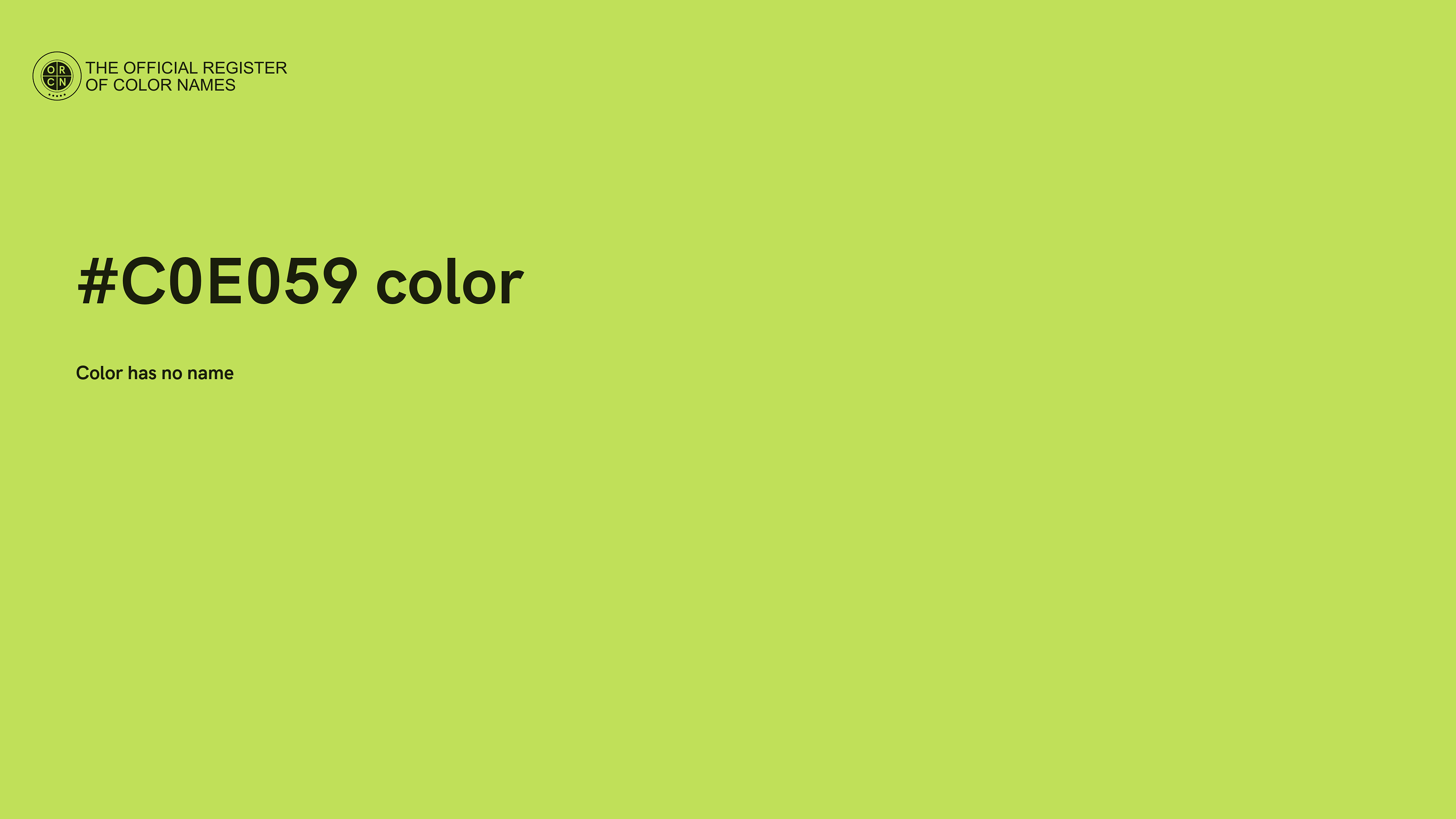 The digital color HEX #C0E059 belongs to the Yellow Color Family featuring High Saturation (Saturation Family) and Very Light (Brightness Family).