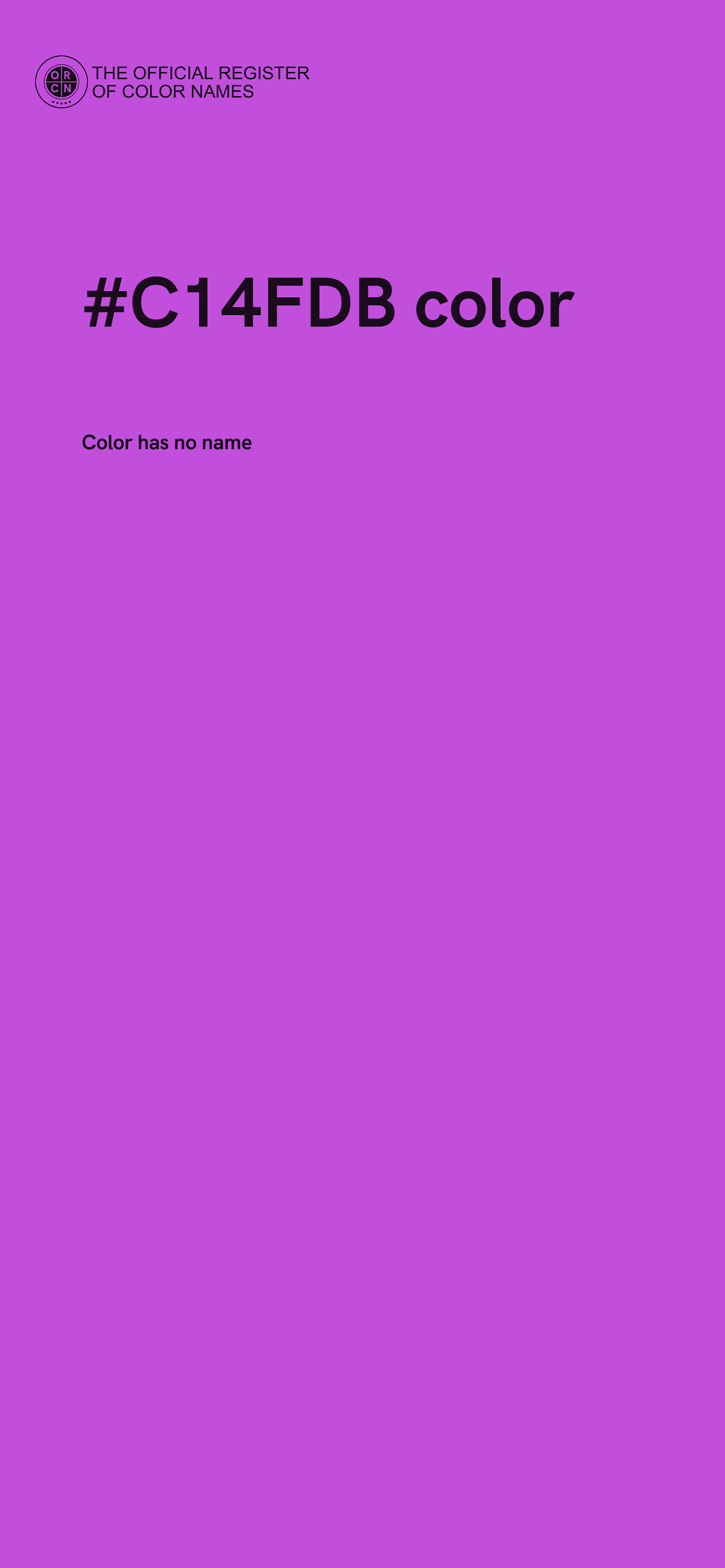 HEX code #C14FDB represent the color in hexadecimal format by combining three values – the amounts of Red, Green and Blue (RGB). Its RGB composition is 193, 79, 219 ( rgb(193, 79, 219) ), which breaks down into 75.7% of Red, 31% Green and 85.9% Blue.