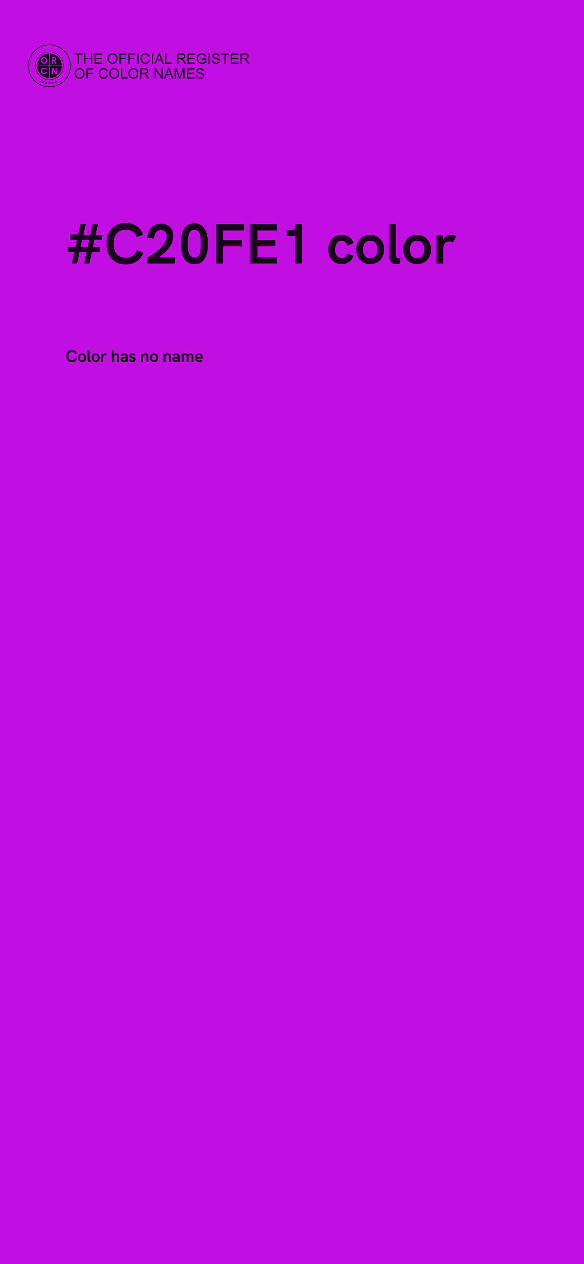 The digital color HEX #C20FE1 belongs to the Magenta Color Family featuring Full Saturation (Saturation Family) and Light (Brightness Family).