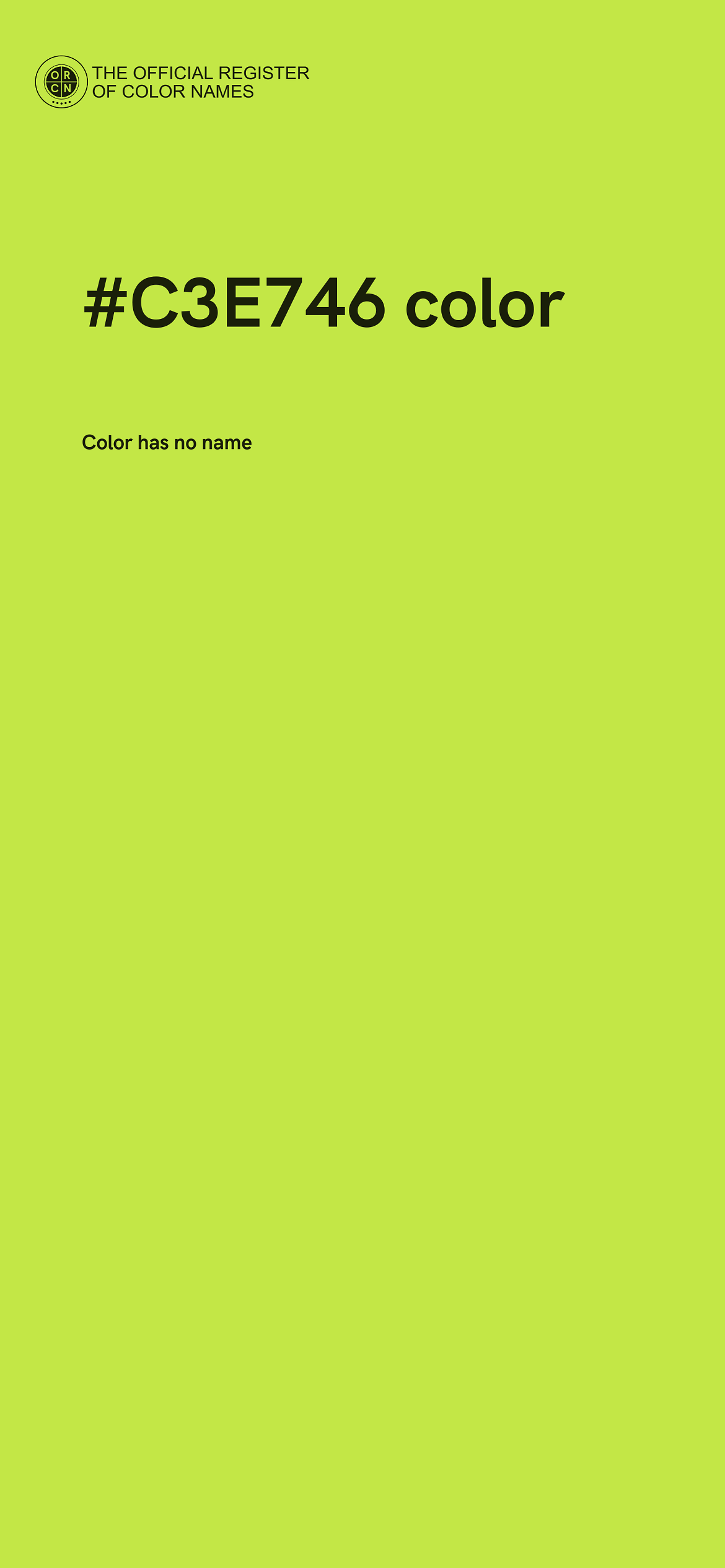 For printing in non digital world, #C3E746 is represented in CMYK as 14 Cyan, 0 Magenta, 63 Yellow, and 9 Black (Key) (C:14 M:0 Y:63 K:9).