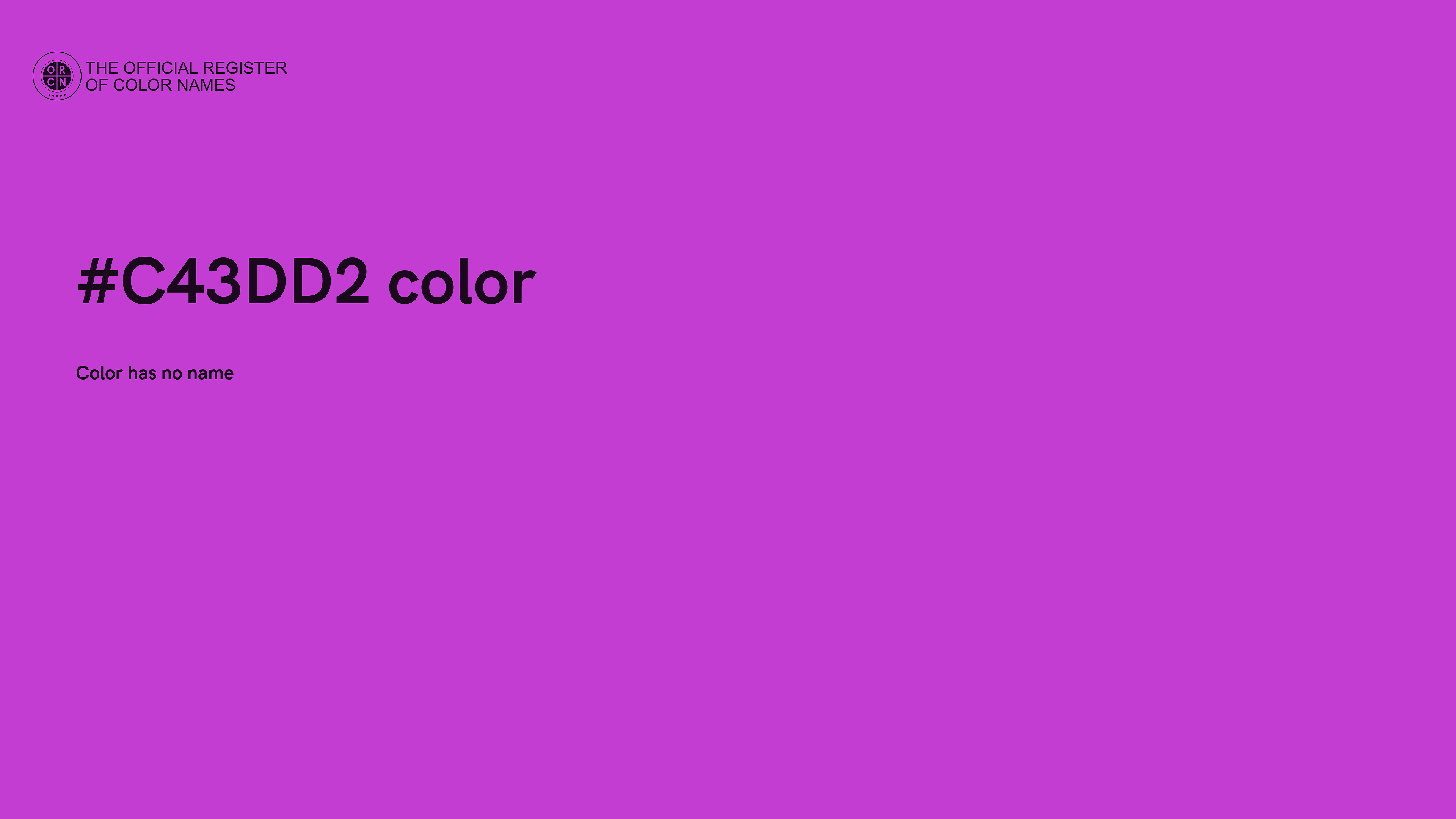 HEX code #C43DD2 represent the color in hexadecimal format by combining three values – the amounts of Red, Green and Blue (RGB). Its RGB composition is 196, 61, 210 ( rgb(196, 61, 210) ), which breaks down into 76.9% of Red, 23.9% Green and 82.4% Blue.