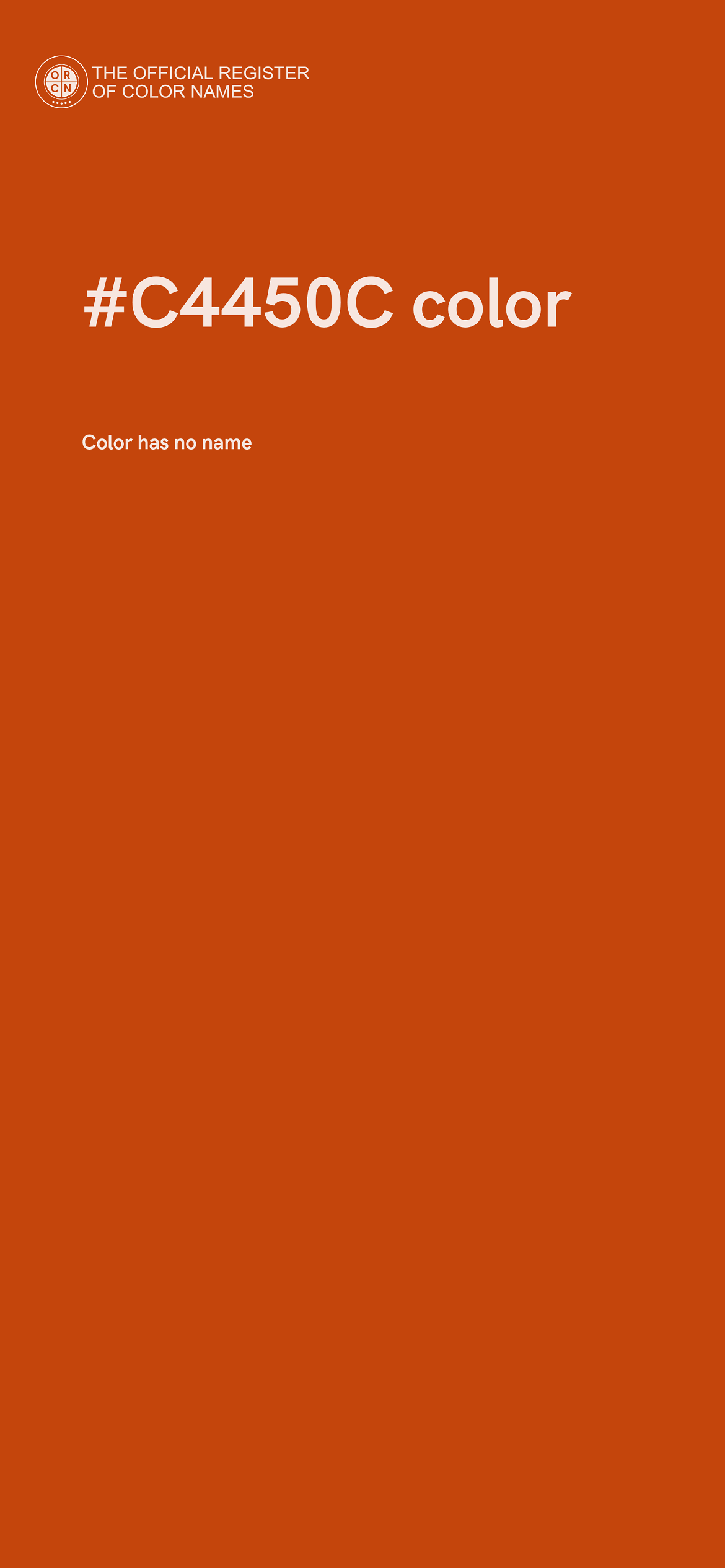 The digital color HEX #C4450C belongs to the Orange Color Family featuring Full Saturation (Saturation Family) and Light (Brightness Family).