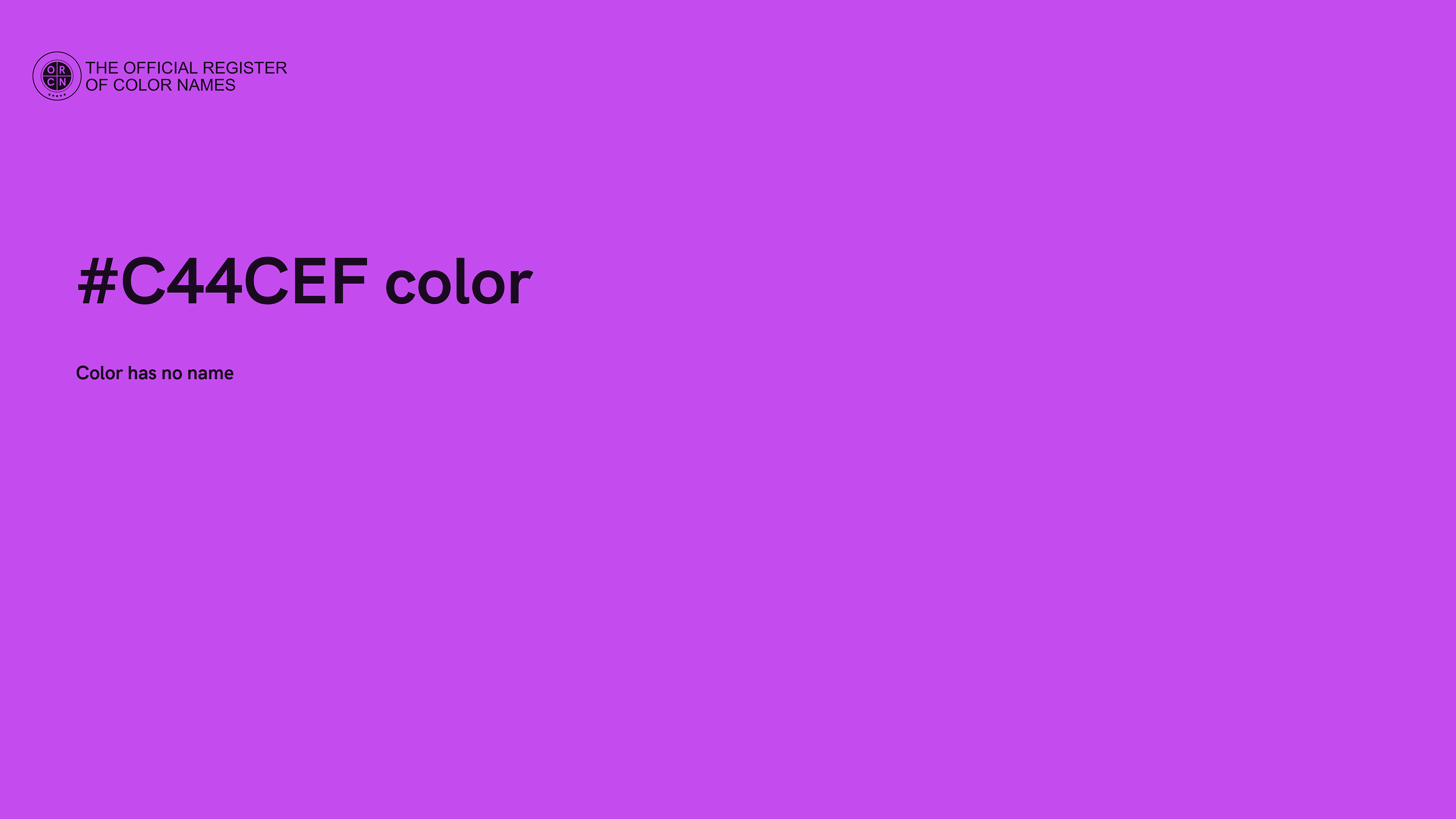 HEX code #C44CEF represent the color in hexadecimal format by combining three values – the amounts of Red, Green and Blue (RGB). Its RGB composition is 196, 76, 239 ( rgb(196, 76, 239) ), which breaks down into 76.9% of Red, 29.8% Green and 93.7% Blue.