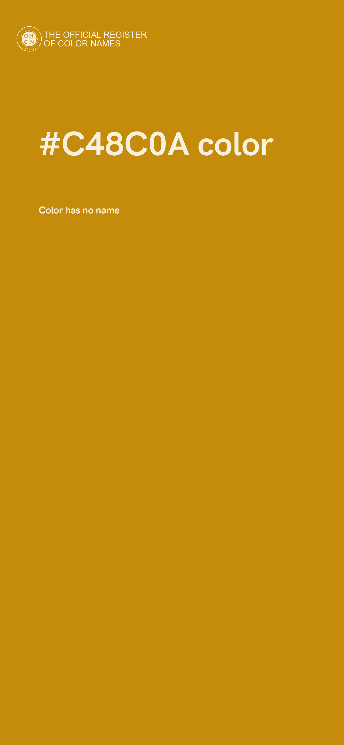 The digital color HEX #C48C0A belongs to the Orange Color Family featuring Full Saturation (Saturation Family) and Light (Brightness Family).