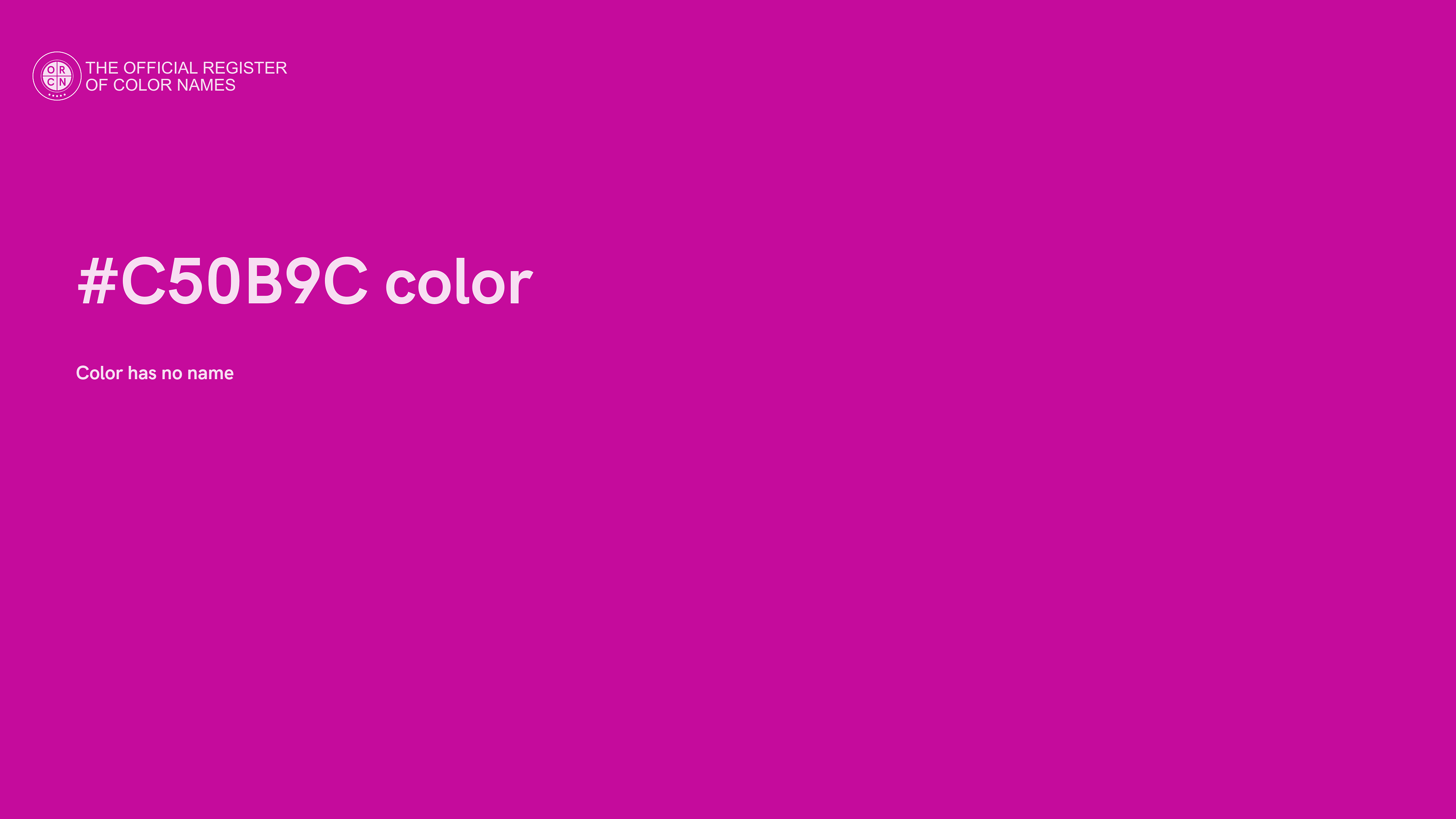 HEX code #C50B9C represent the color in hexadecimal format by combining three values – the amounts of Red, Green and Blue (RGB). Its RGB composition is 197, 11, 156 ( rgb(197, 11, 156) ), which breaks down into 77.3% of Red, 4.3% Green and 61.2% Blue.