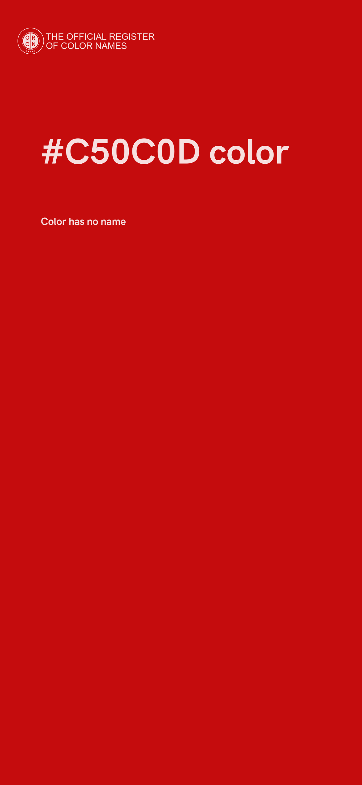 The digital color HEX #C50C0D belongs to the Red Color Family featuring Full Saturation (Saturation Family) and Light (Brightness Family).