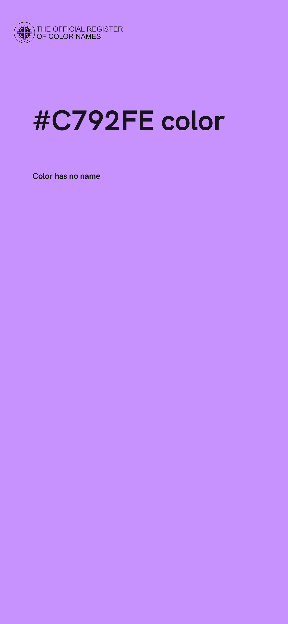 The digital color HEX #C792FE belongs to the Violet Color Family featuring Full Saturation (Saturation Family) and Very Light (Brightness Family).