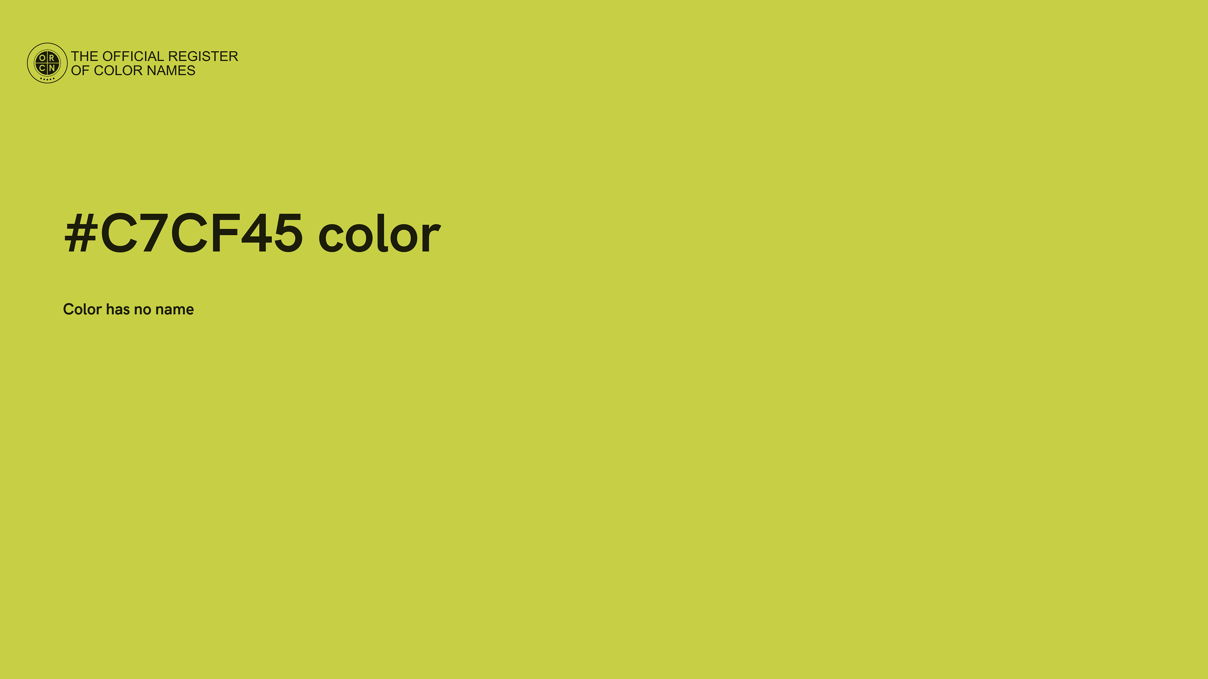 The digital color HEX #C7CF45 belongs to the Yellow Color Family featuring Moderate Saturation (Saturation Family) and Light (Brightness Family).