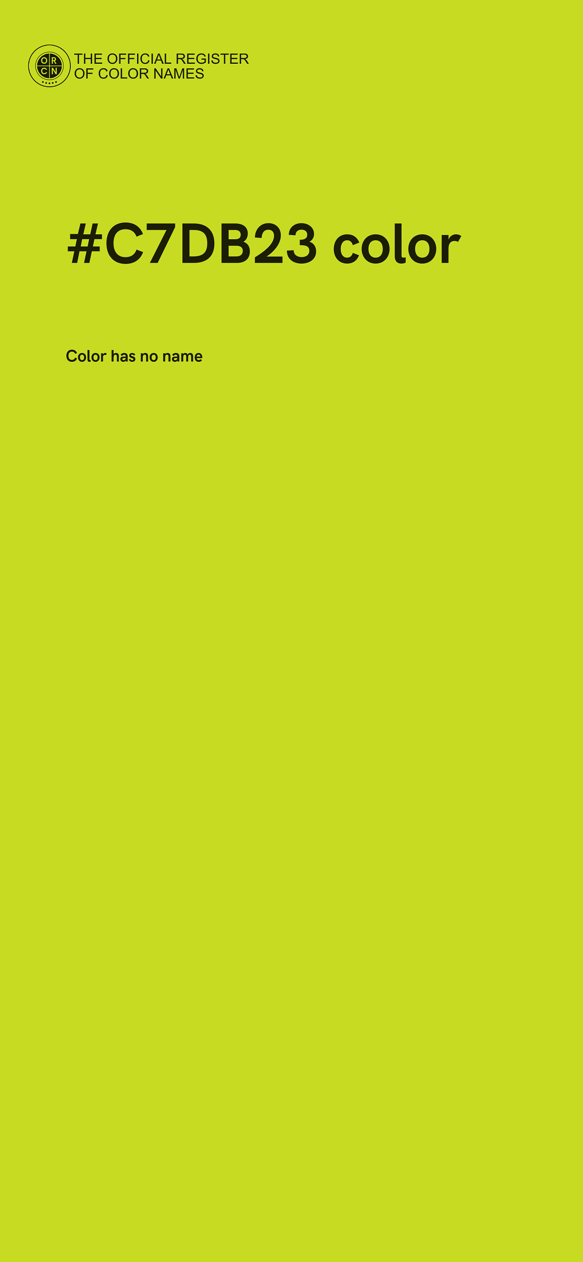 The digital color HEX #C7DB23 belongs to the Yellow Color Family featuring High Saturation (Saturation Family) and Light (Brightness Family).