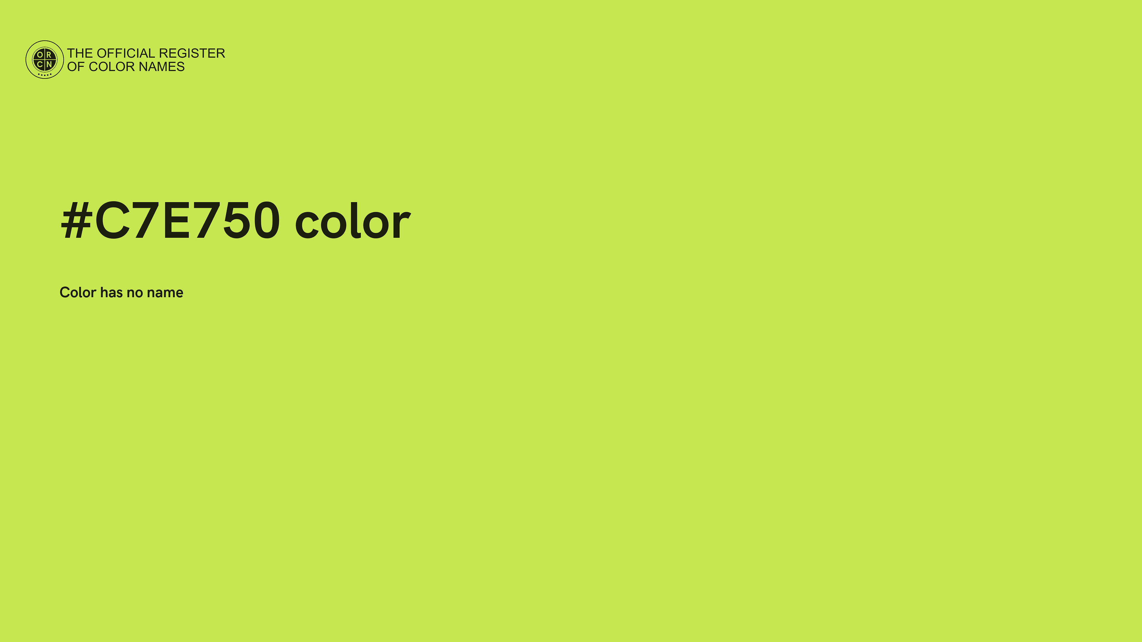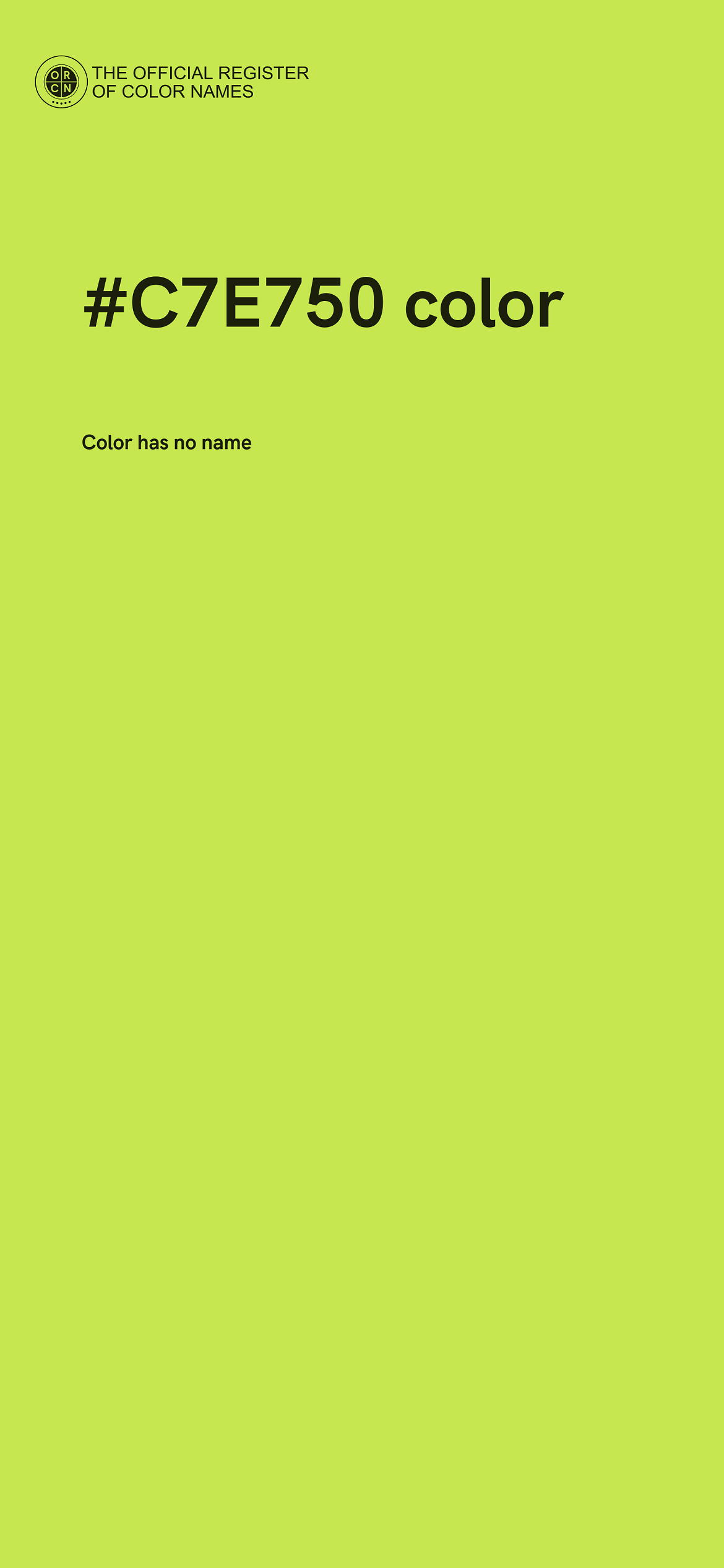 The digital color HEX #C7E750 belongs to the Yellow Color Family featuring High Saturation (Saturation Family) and Very Light (Brightness Family).