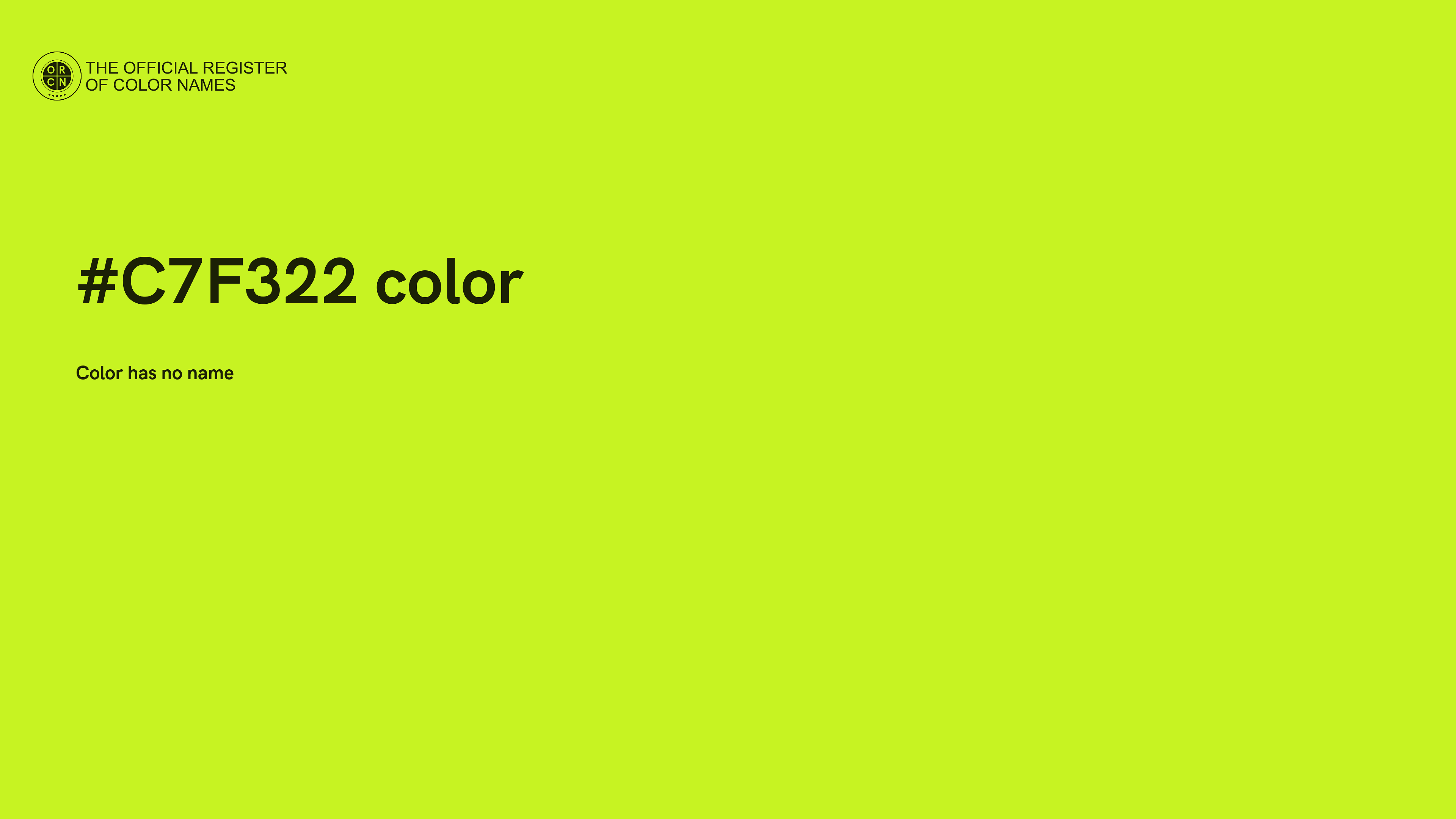 The digital color HEX #C7F322 belongs to the Yellow Color Family featuring Full Saturation (Saturation Family) and Light (Brightness Family).