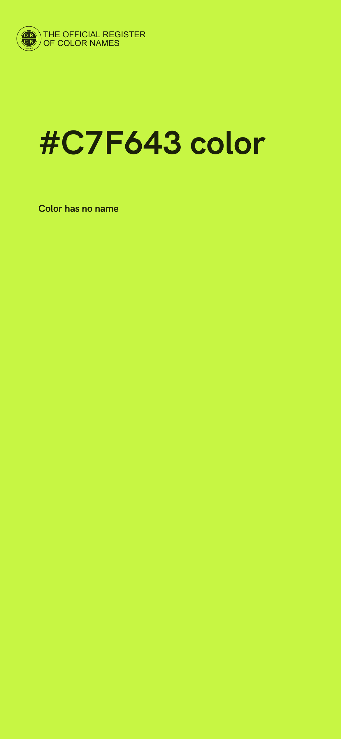 The digital color HEX #C7F643 belongs to the Chartreuse Color Family featuring Full Saturation (Saturation Family) and Very Light (Brightness Family).