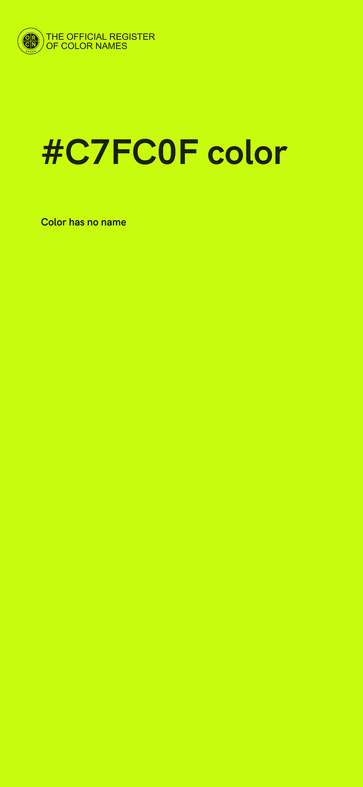 The digital color HEX #C7FC0F belongs to the Yellow Color Family featuring Full Saturation (Saturation Family) and Light (Brightness Family).