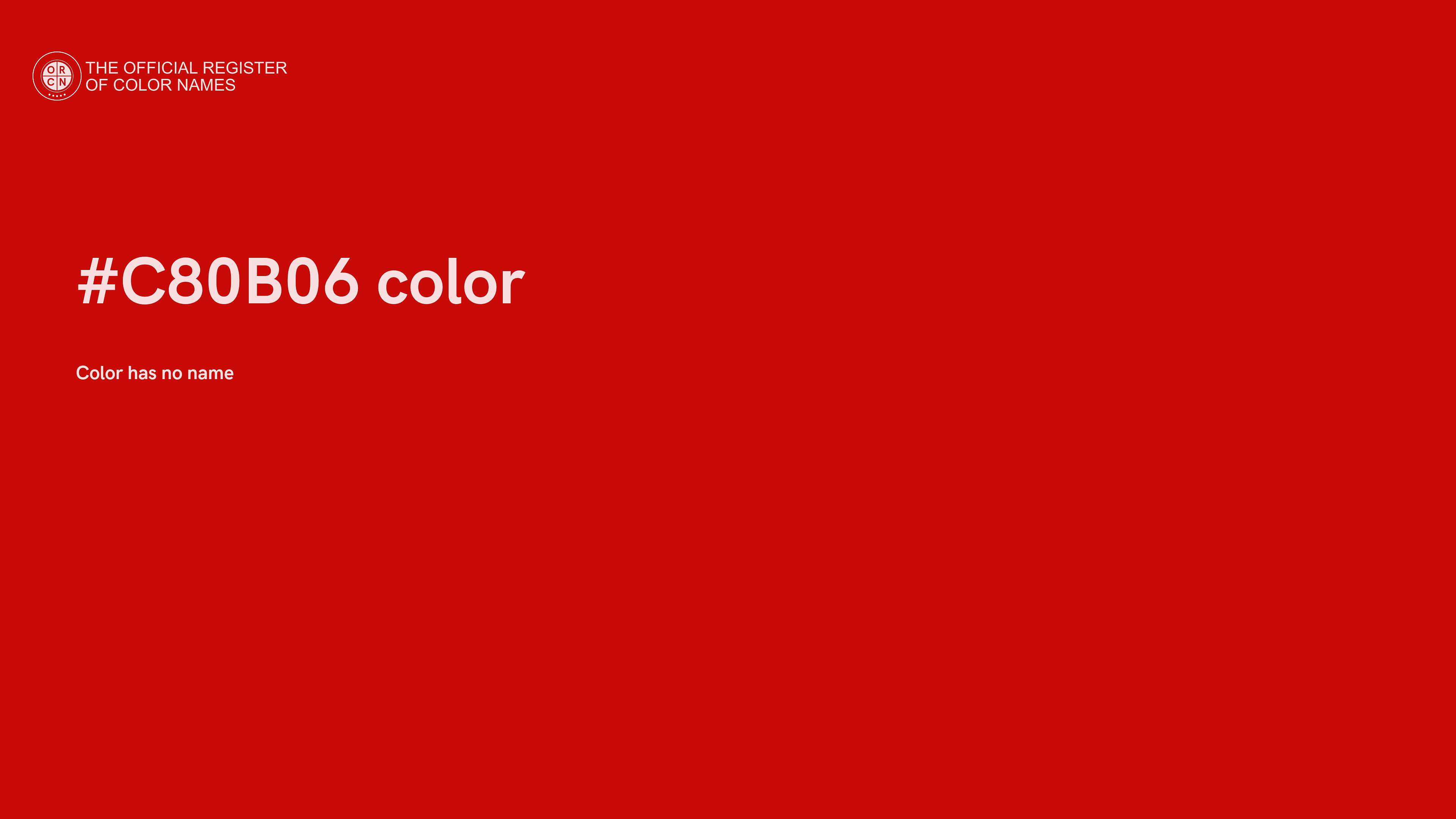 HEX code #C80B06 represent the color in hexadecimal format by combining three values – the amounts of Red, Green and Blue (RGB). Its RGB composition is 200, 11, 6 ( rgb(200, 11, 6) ), which breaks down into 78.4% of Red, 4.3% Green and 2.4% Blue.