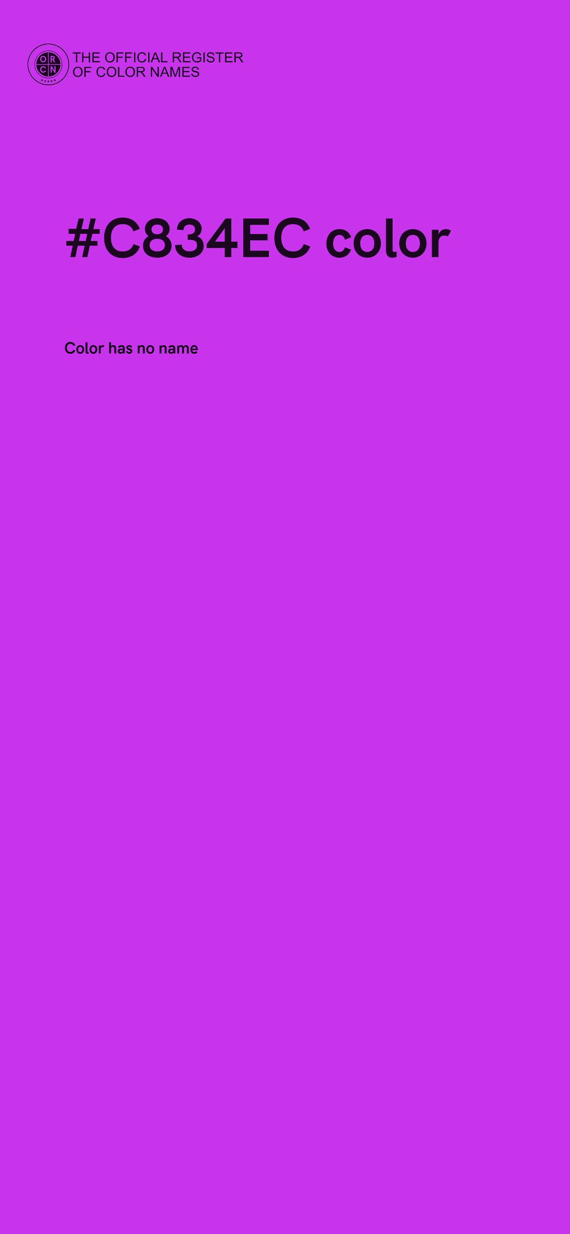 HEX code #C834EC represent the color in hexadecimal format by combining three values – the amounts of Red, Green and Blue (RGB). Its RGB composition is 200, 52, 236 ( rgb(200, 52, 236) ), which breaks down into 78.4% of Red, 20.4% Green and 92.5% Blue.